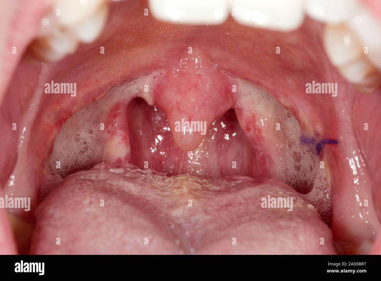 Gola dopo tonsillectomy. Close-up della gola di un 23-anno-vecchio paziente femmina 2 settimane dopo la chirurgia per rimuovere la sua tonsille (tonsillectomy). Questo p Foto stock - Alamy
