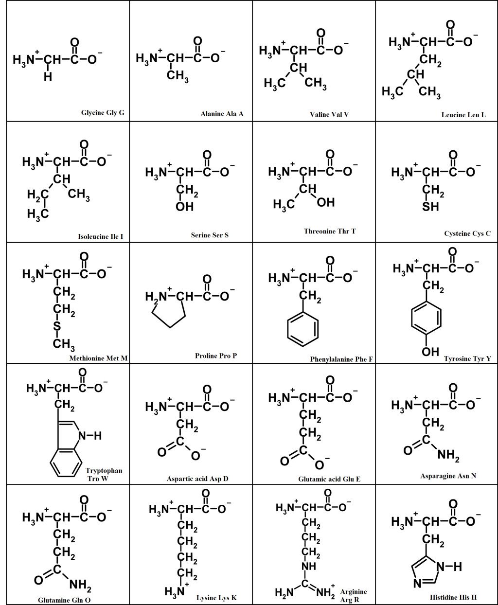 1: Chemical structure for the 20 amino acids that are found in all... | Download Scientific Diagram