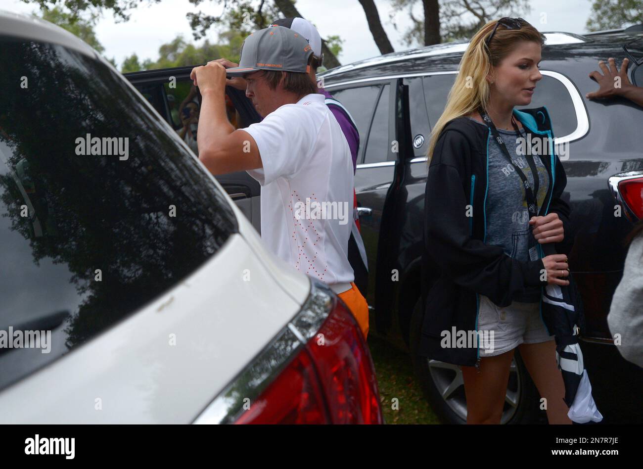 Rickie Fowler, left, and his girlfriend, Alexandra Browne, leave the course in awaiting vehicles behind the second green after players were called off the course due to an approaching severe thunderstorm during