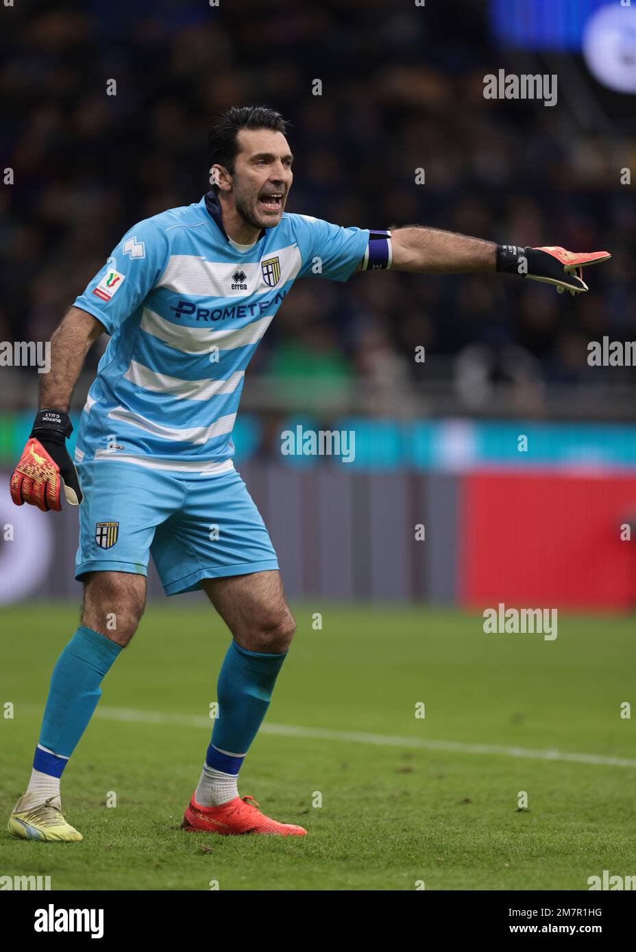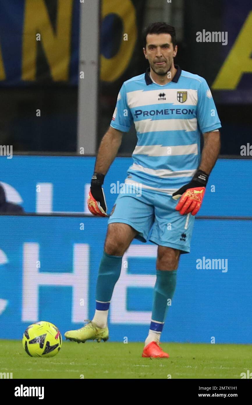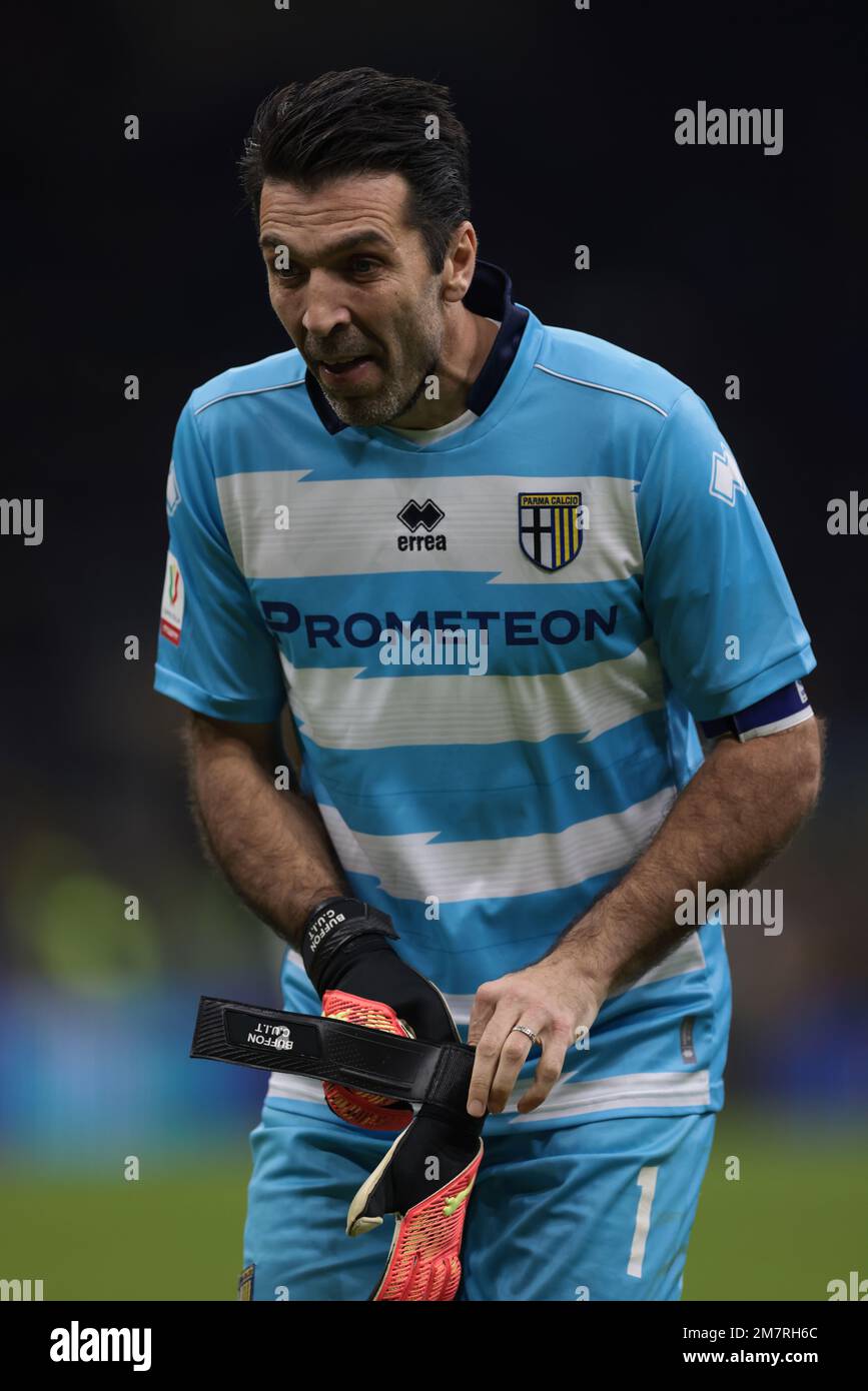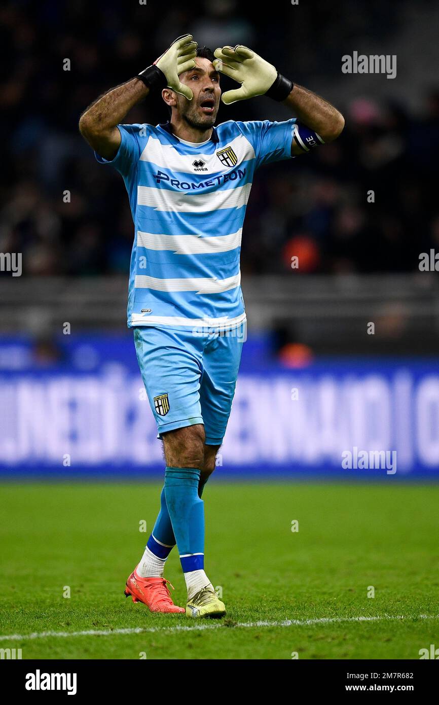 Milan, Italy, 10/01/2023, Gianluigi Buffon of Parma Calcio gestures during Coppa Italia 2022/23 football match between FC Internazionale and Parma Calcio at Giuseppe Meazza Stadium, Milan, Italy on January 10, 2023 Stock Photo - Alamy