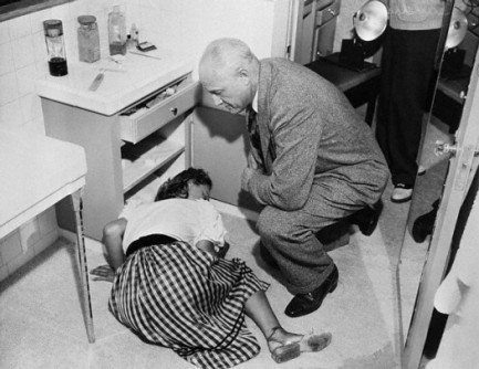 The body of screen star Carole Landis lies sprawled on the bathroom floor of her home near Los Angeles, July 5, 1948 where she was found by actor Rex Harrison and the