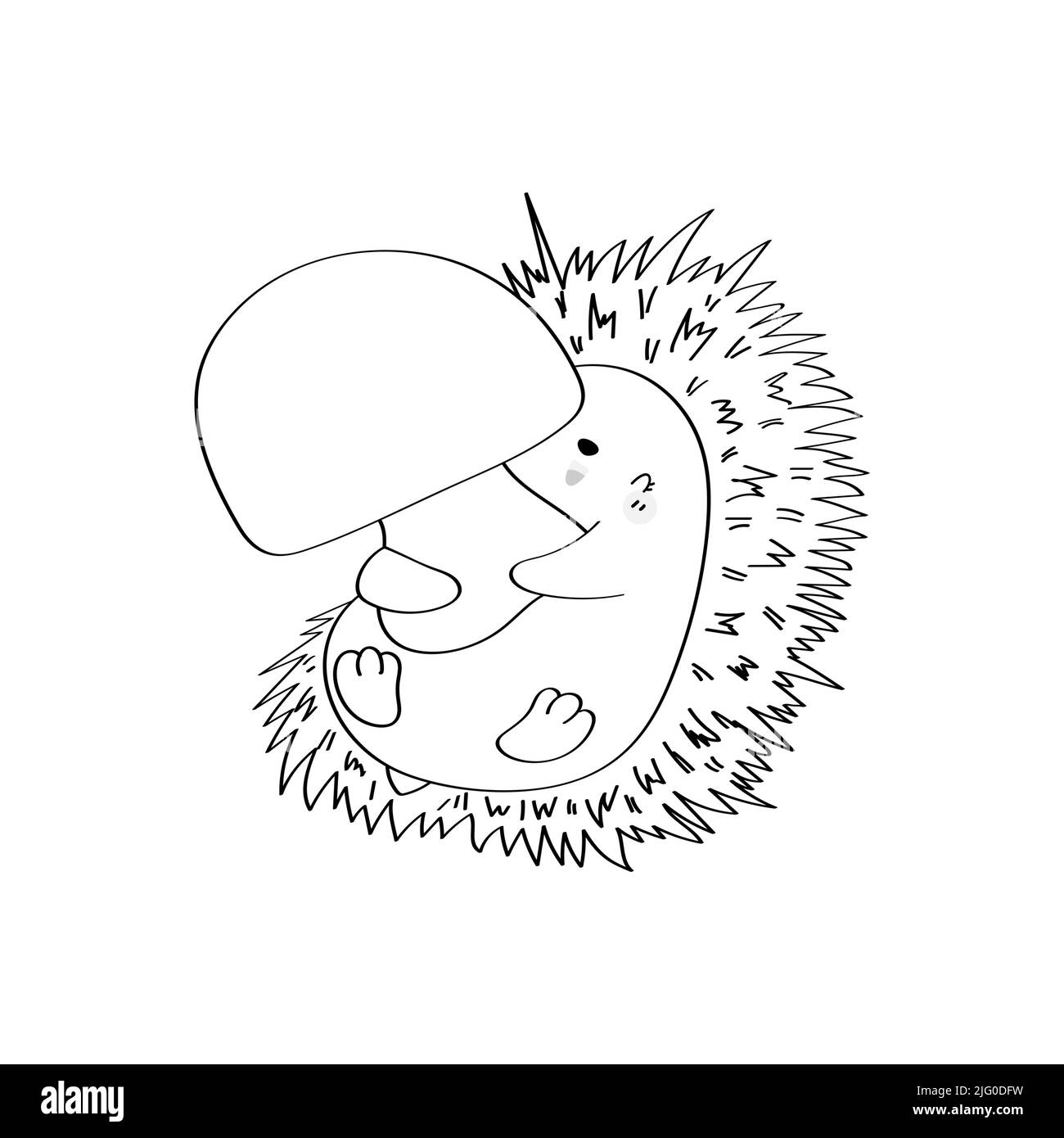 Simpatico riccio bianco e nero con funghi, mele, foglie su spine. carattere autunnale di contorno vettoriale. icona della linea di animali del bosco autunnale. divertente foresta o illustrazione del giorno del ringraziamento.