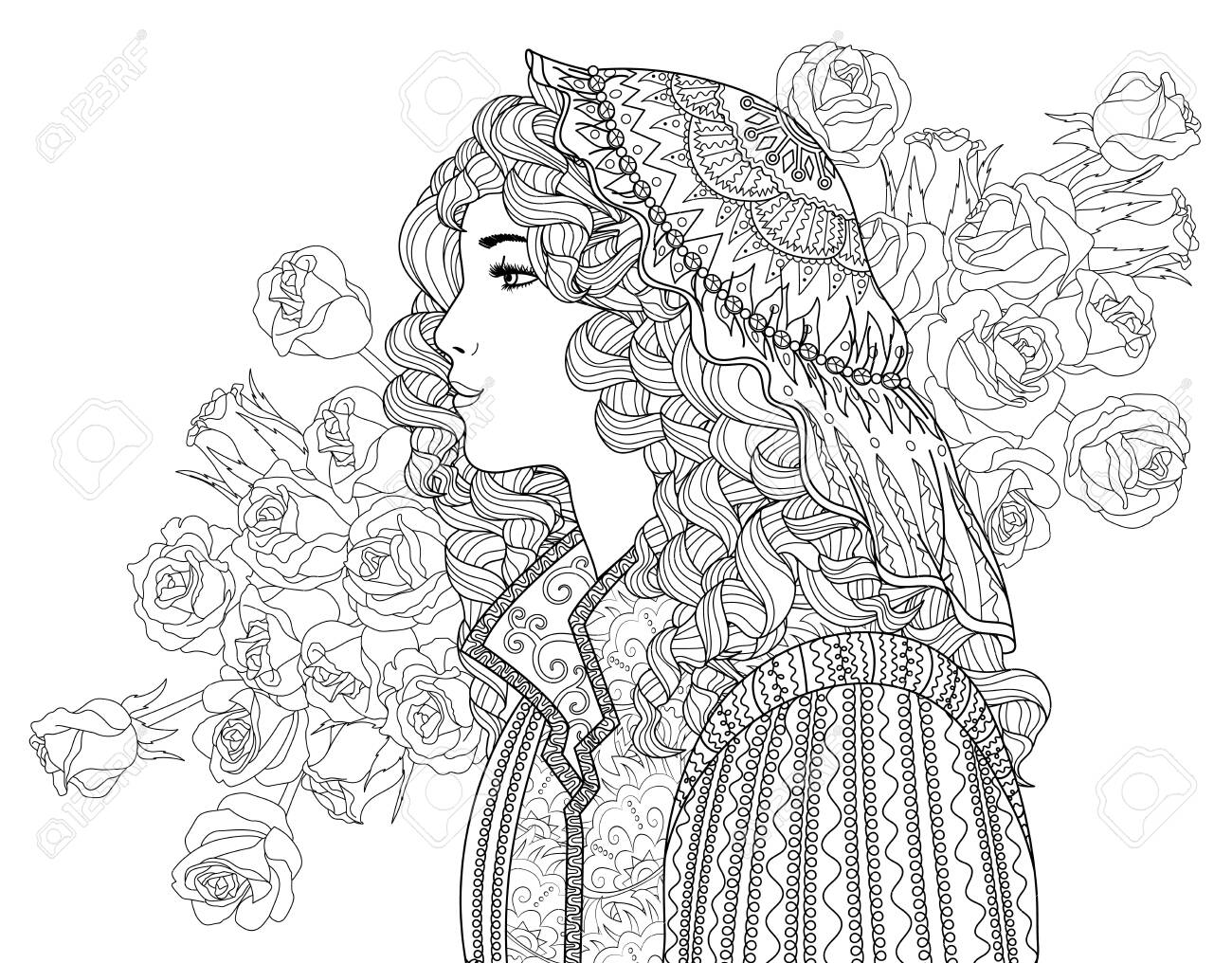 SVG, Vettoriale - Pagina Da Colorare Per Adulti Con Bella Donna Fantasy In Abito Medievale. Libro Da Colorare Con Misteriosa Principessa Con Rose Da Colorare.. Image 141063150