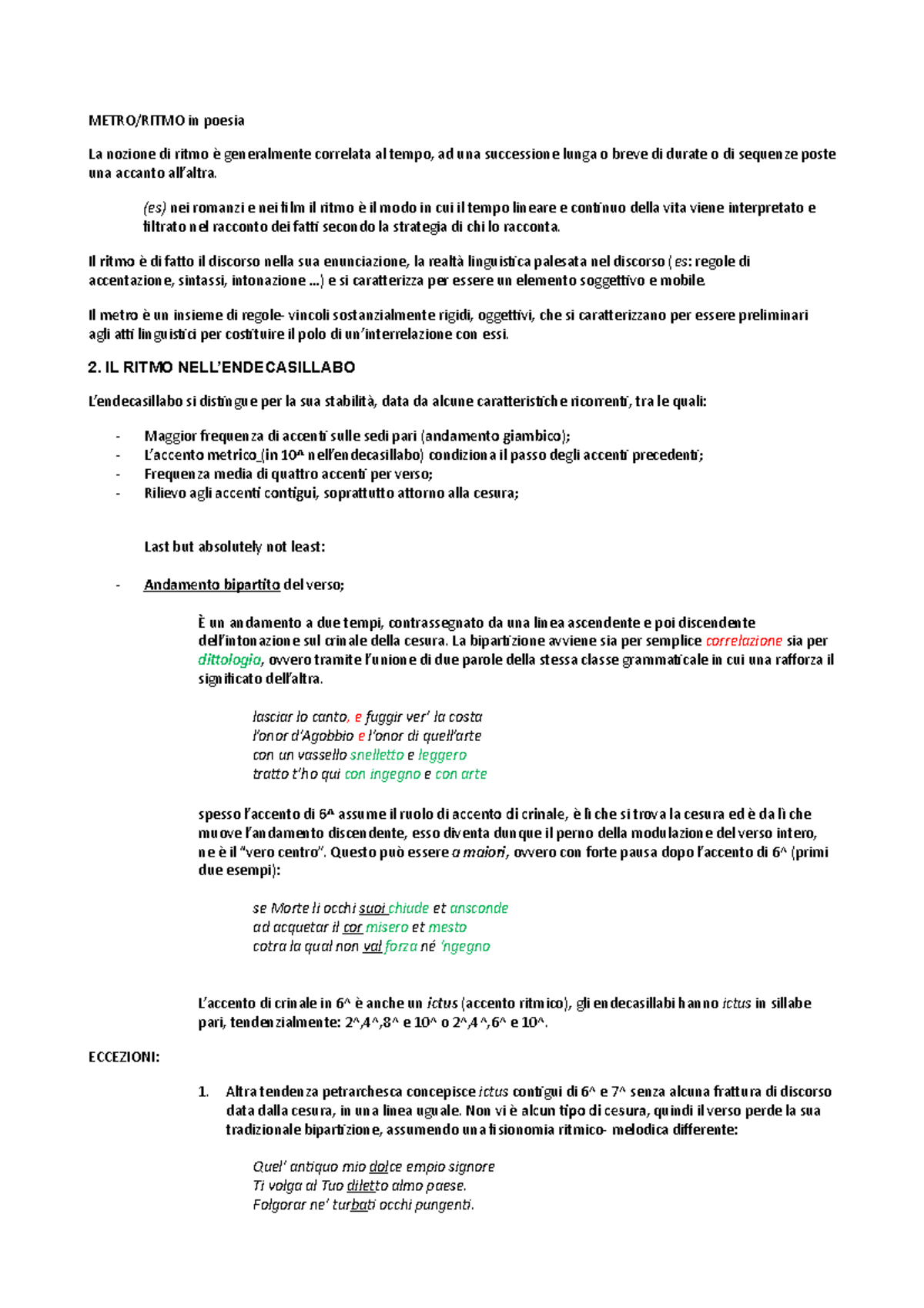 Metro e Ritmo in poesia - METRO/RITMO in poesia La nozione di ritmo è generalmente correlata al - Studocu