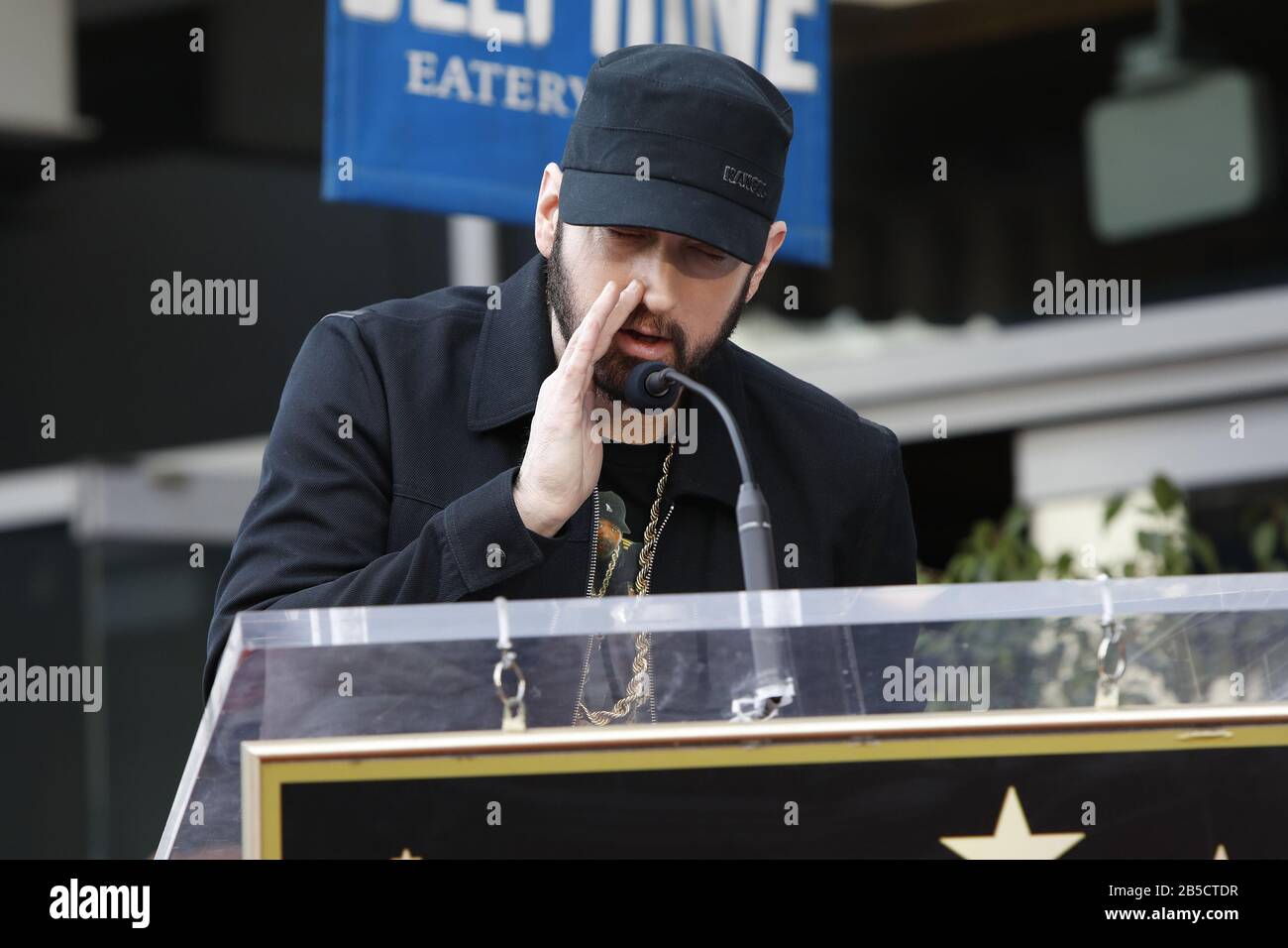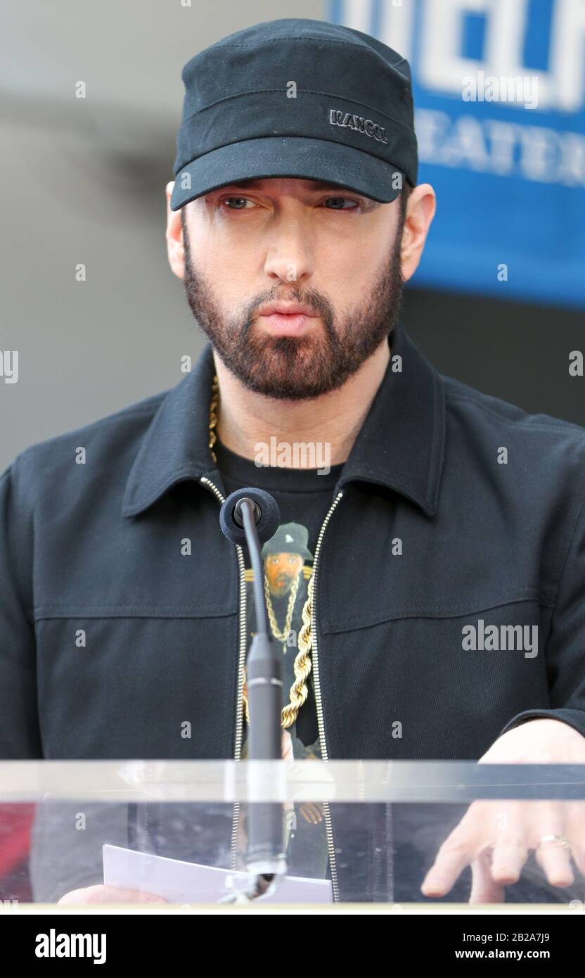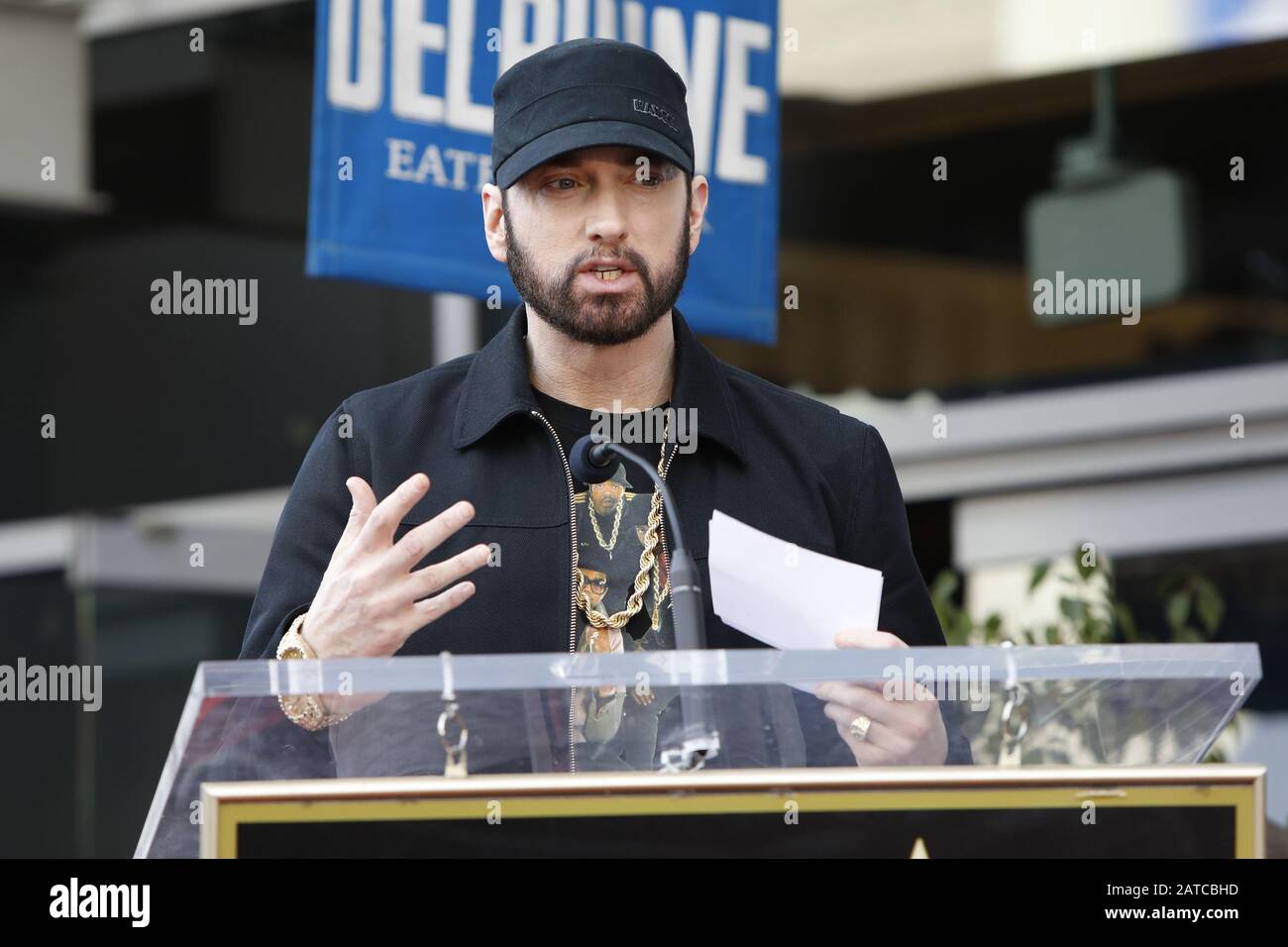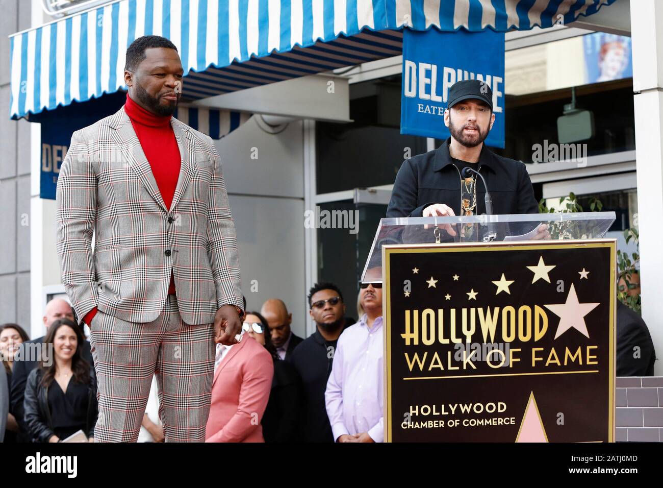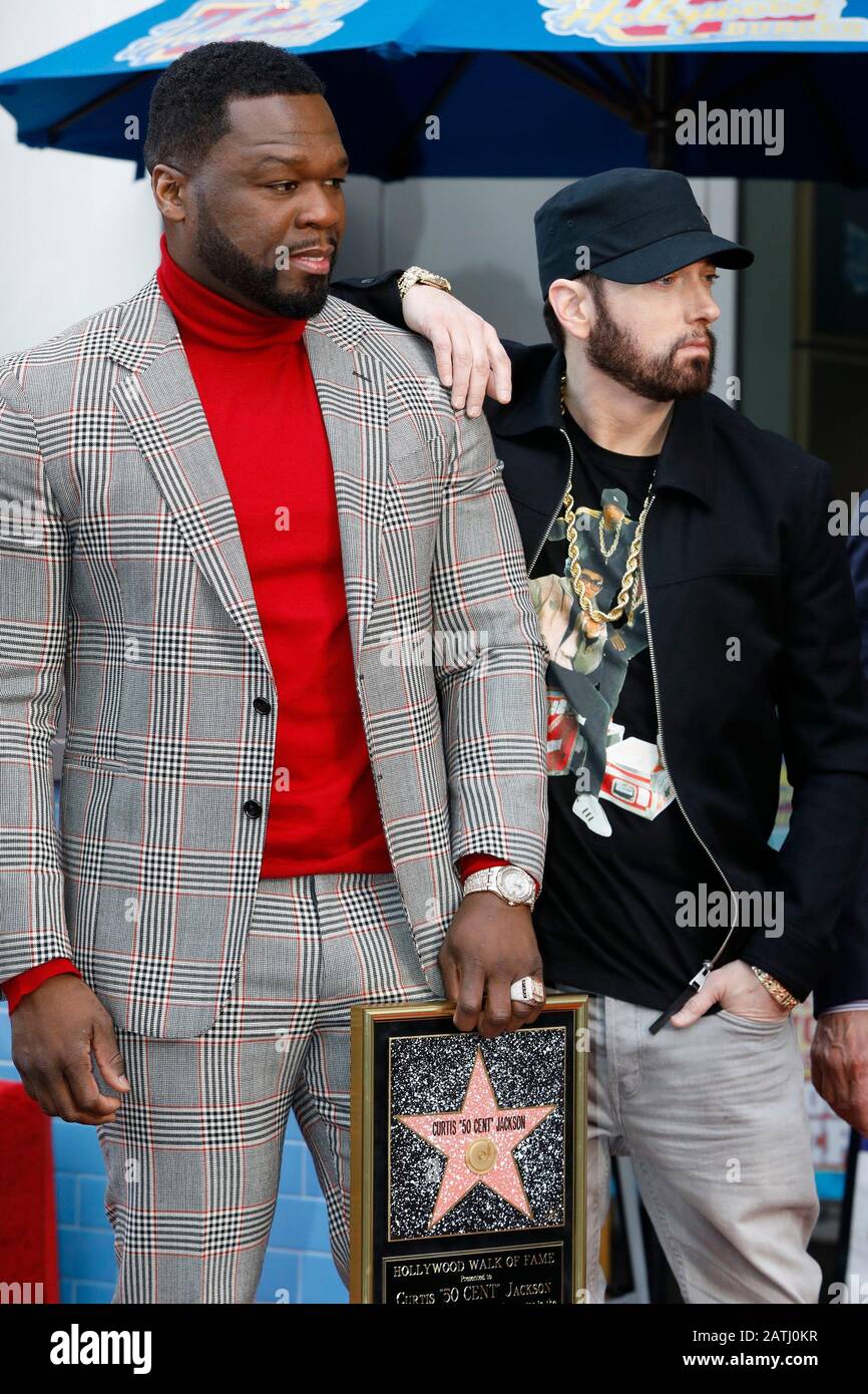 Eminem, Marshall Bruce Mathers III attends 50 Cent (Curtis Jackson III) being honored with a star on The Hollywood Walk Of Fame on January 30, 2020 in Los Angeles, California USA (Photo