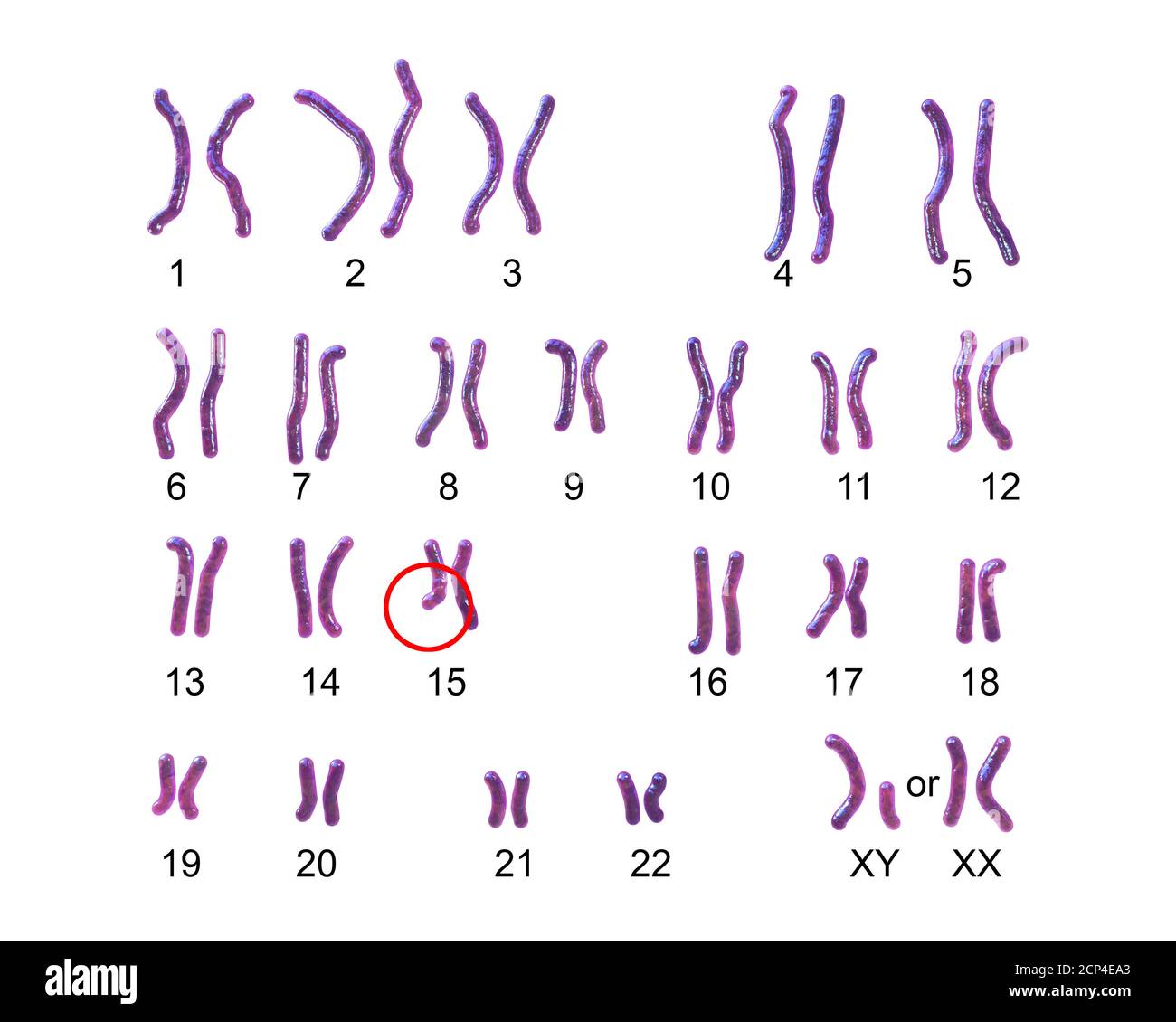 Cariotipo della sindrome di Angelman (AS), illustrazione del computer. COME è un disturbo genetico caratterizzato da flaping del braccio, eccessivo ridere (anche quando ferito Foto stock - Alamy