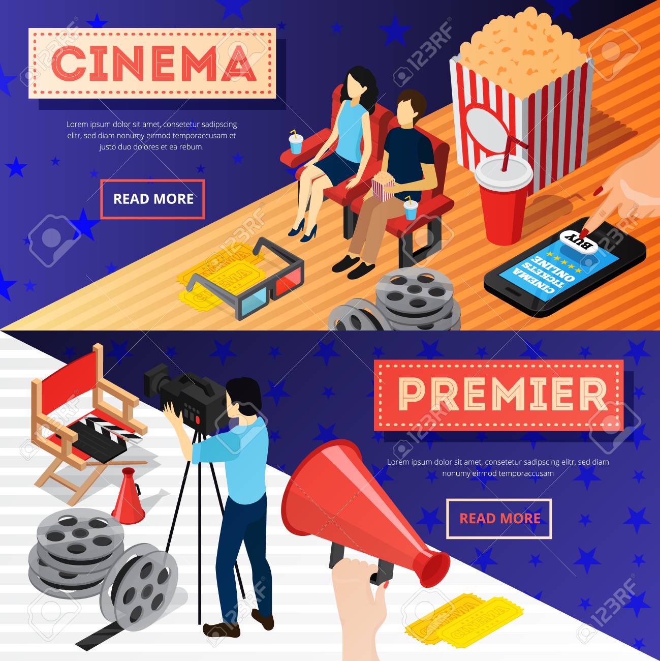 Cinema 3d Isometric Banners With Conceptual Images Of Popcorn Film Reel Online Tickets And Camera Operator Vector Illustration Royalty Free SVG, Cliparts, Vectors, and Stock Illustration. Image 74915189.