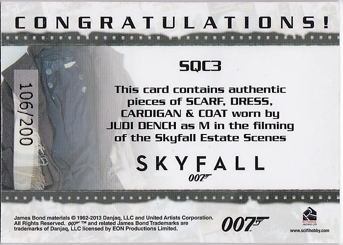 JAMES BOND AUTOGRAPHS & RELICS SQC3 JUDI DENCH M SKYFALL QUAD COSTUME 106/200 | eBay