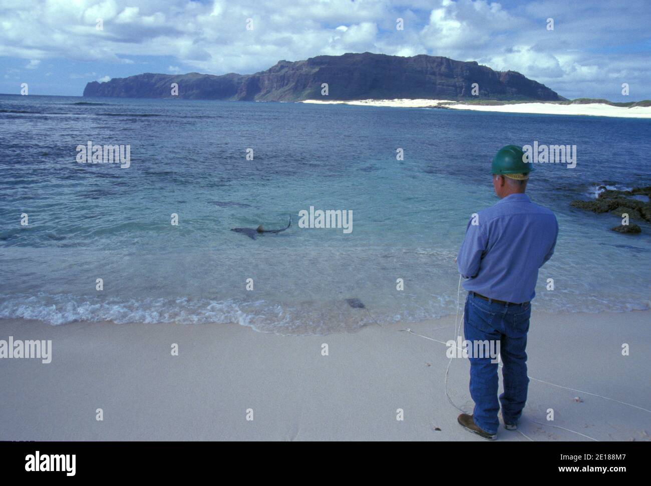 Keith Robinson watches a reef shark swimming in shallow waters off ...