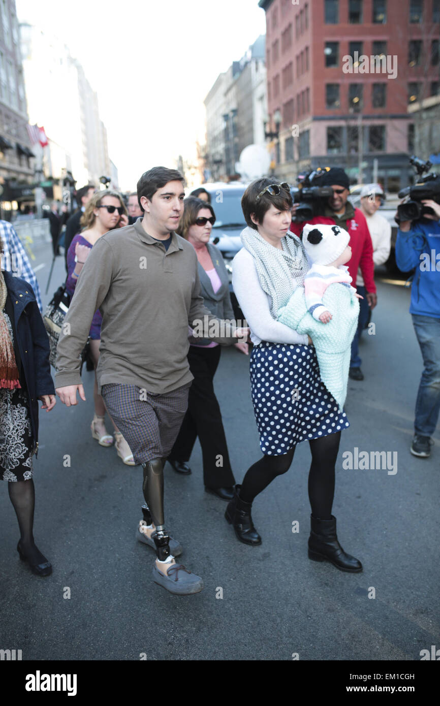 Boston, Massachusetts, USA. Xv Apr, 2015. Maratona di Boston vittima di bombardamenti Jeff Bauman è affiancato dalla moglie Erin e figlia Nora Gail come camminano giù Boylston Street a Boston, Massachusetts vicino