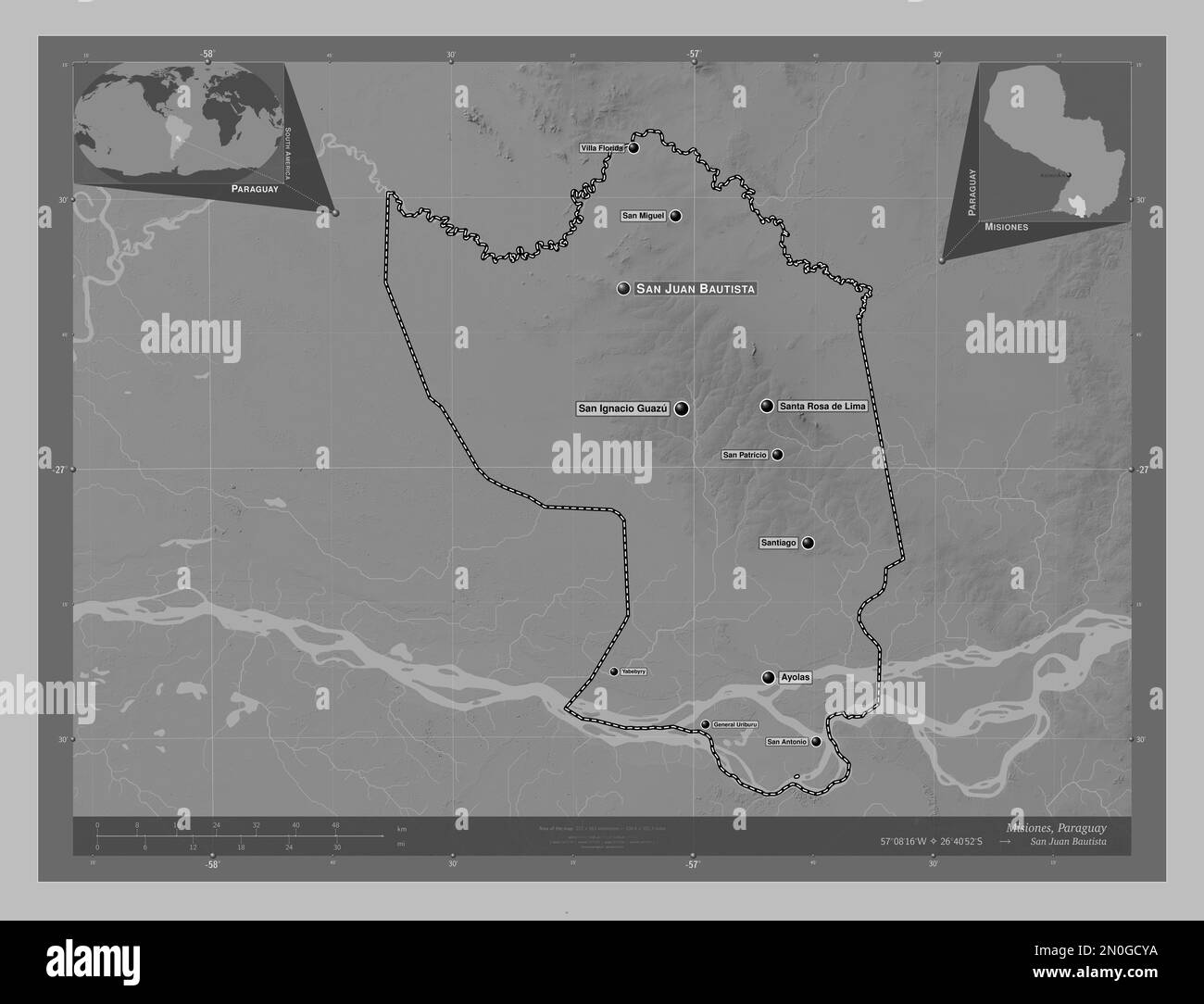 Misiones, dipartimento del Paraguay. Mappa in scala di grigi con laghi e fiumi. Località e nomi delle principali città della regione. Ausiliario angolo l Foto stock - Alamy