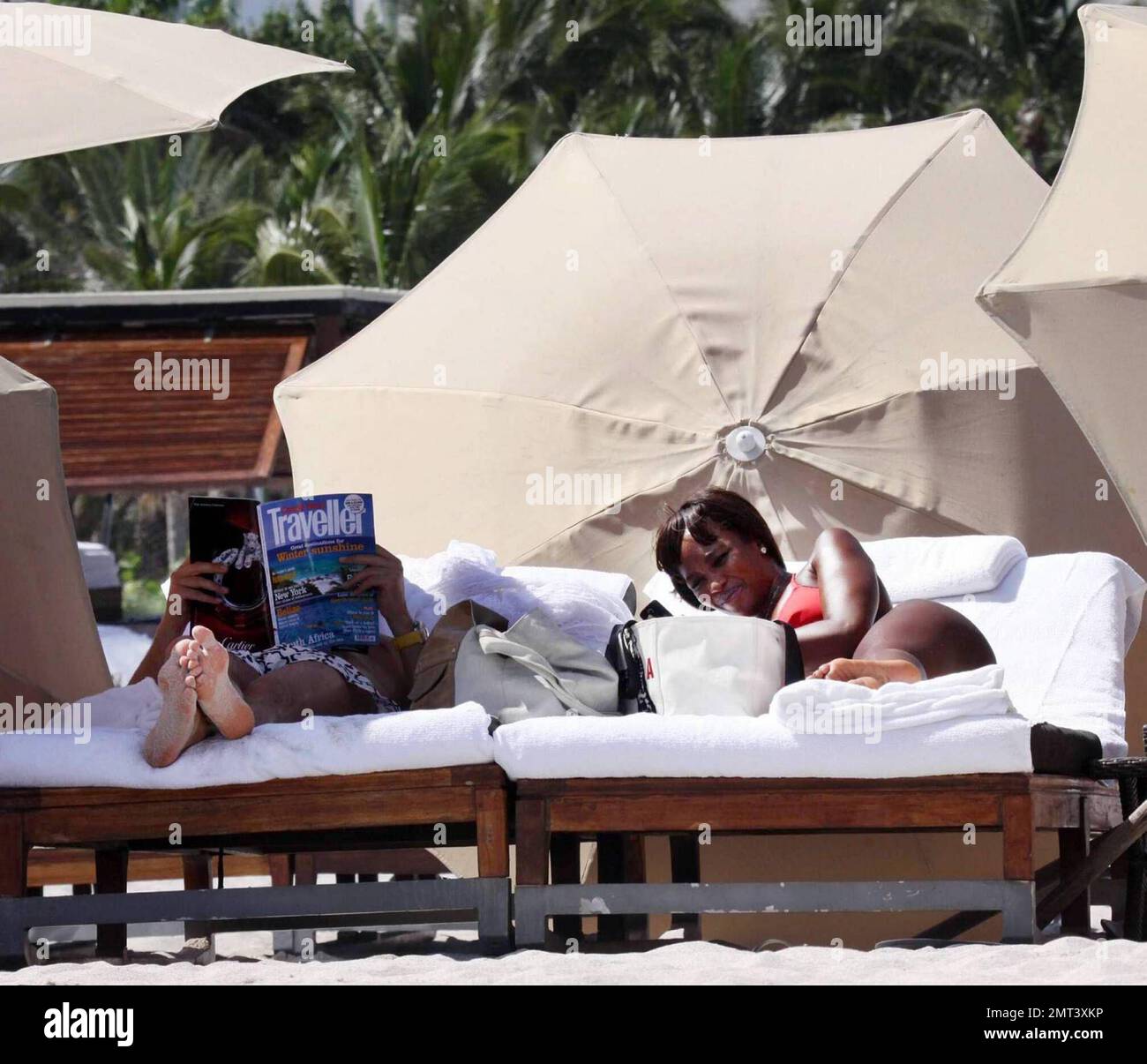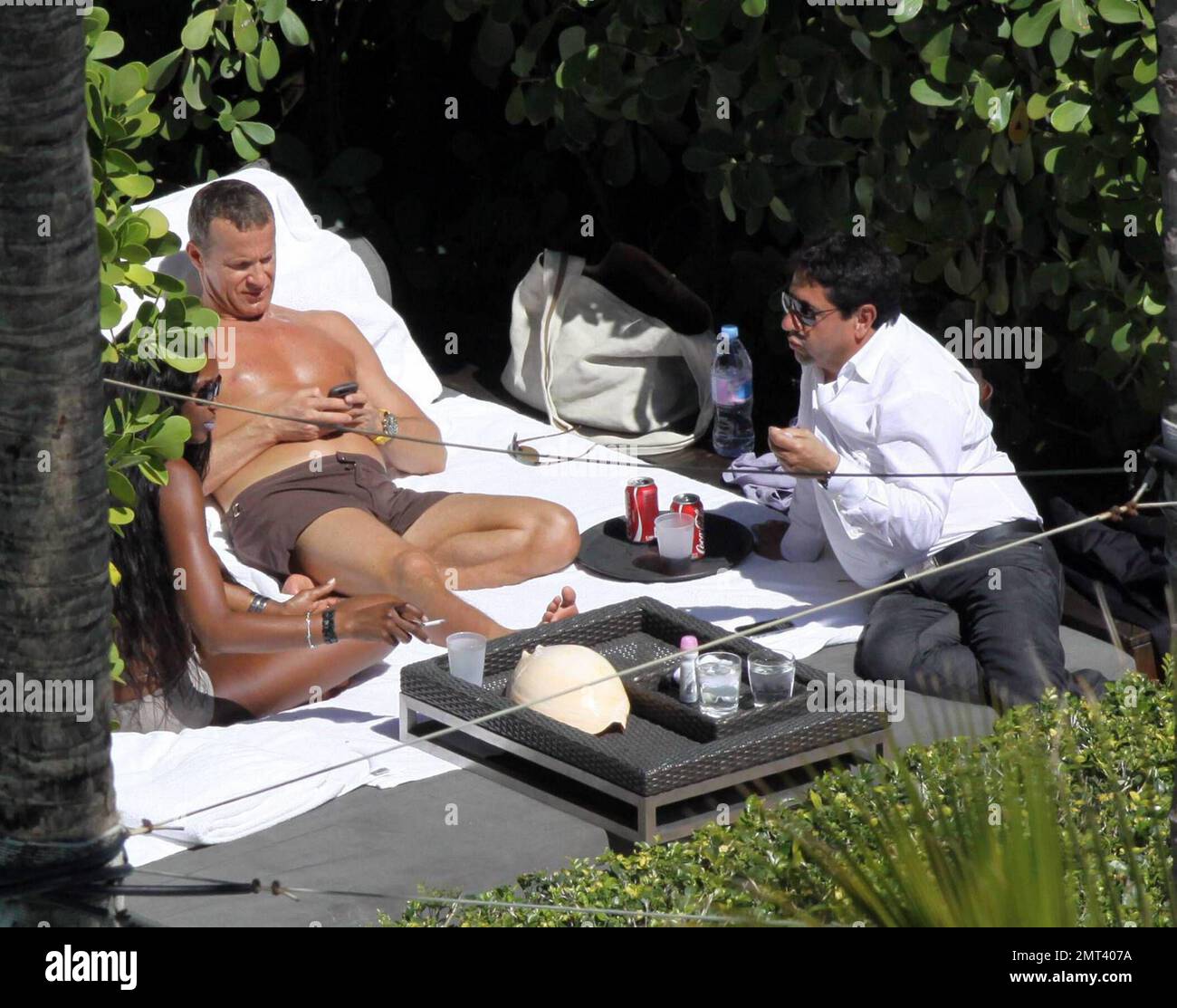 Esclusivo!! Naomi Campbell e il suo fidanzato Vladimir Dornin trascorrono un pomeriggio a bordo piscina nel loro hotel di lusso. Naomi indossava un bikini grigio pallido e sedette su un lettino fumando