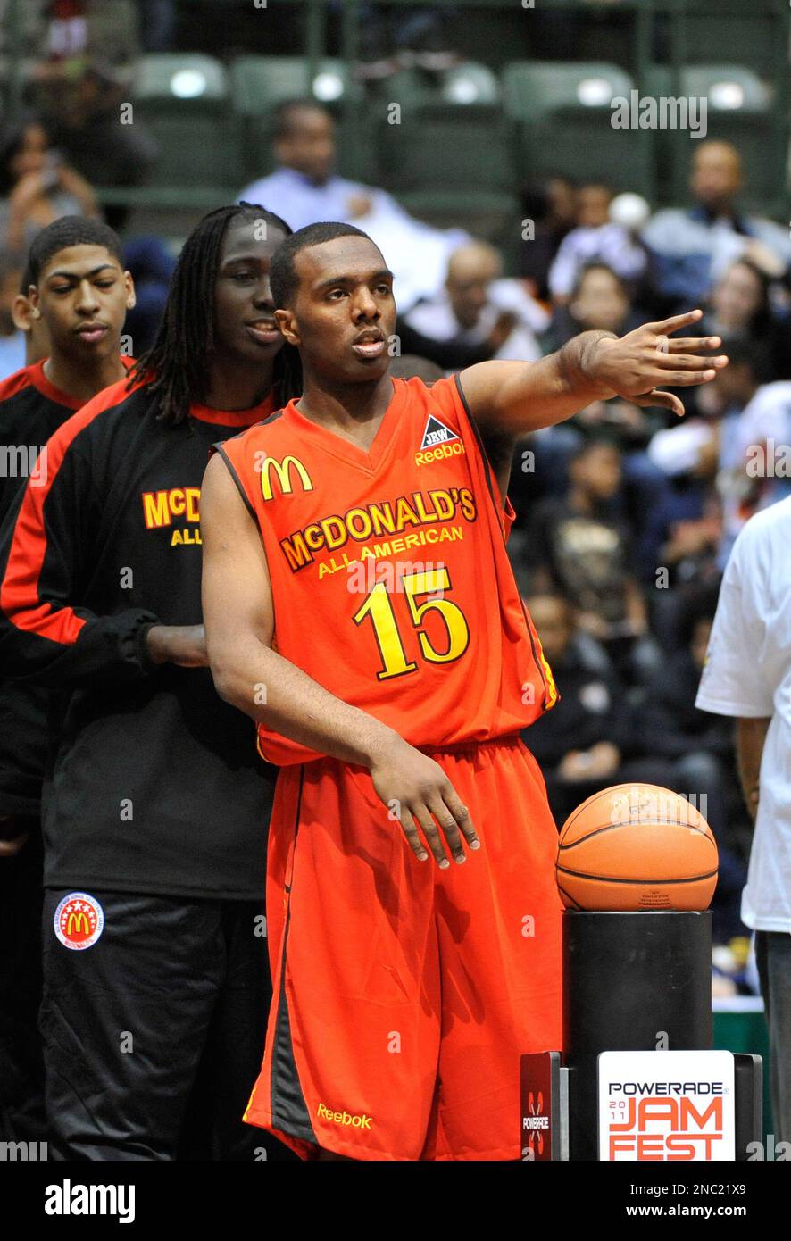 P. J. Hairston (15), from Hargrave Military Academy in Chatham, Va., prepares for the slam dunk contest at the McDonald's High School All American basketball Jam Fest at Chicago State University in