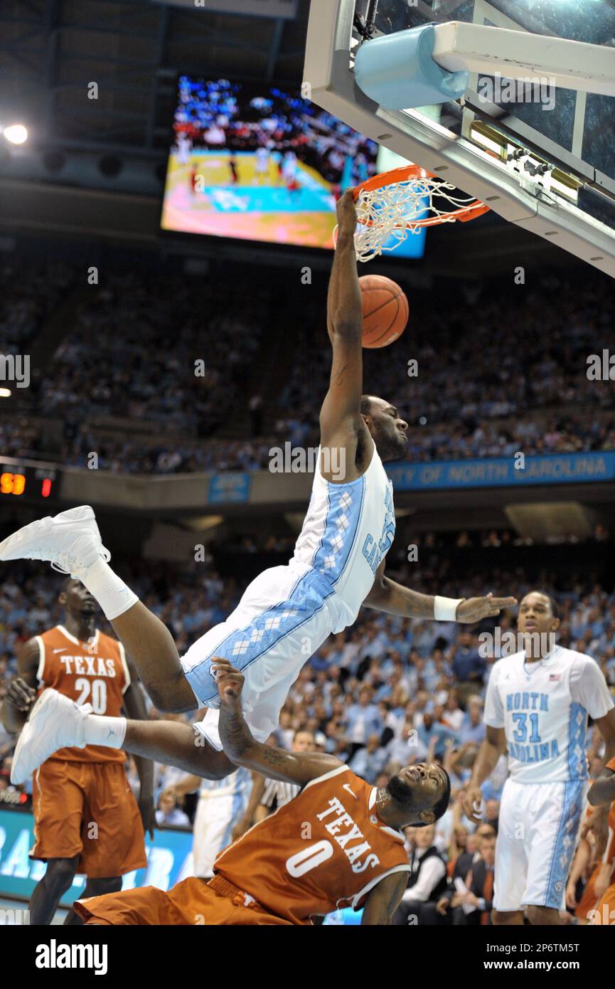 December 21, 2011: P.J. Hairston #15 dunks over Julien Lewis #2 during NCAA Basketball game between the North Carolina Tarheels and Texas Longhorns at The Dean E. Smith Center, Chapel HIll, NC. (