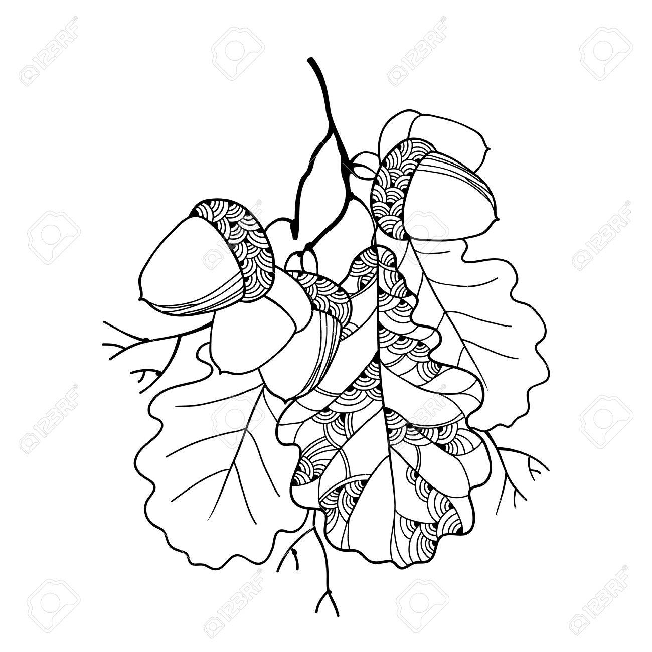 SVG, Vettoriale - Illustrazione Vettoriale Rovere Brunch, Foglie E Ghiande In Stile Doodle. Pagina Del Libro Da Colorare Per Adulti, Gioia Di Ordinare Bambini E Colorista Adulto. Realizzato Da Traccia Da Schizzo. Sfondo Monocromatico In Bianco E Nero ...