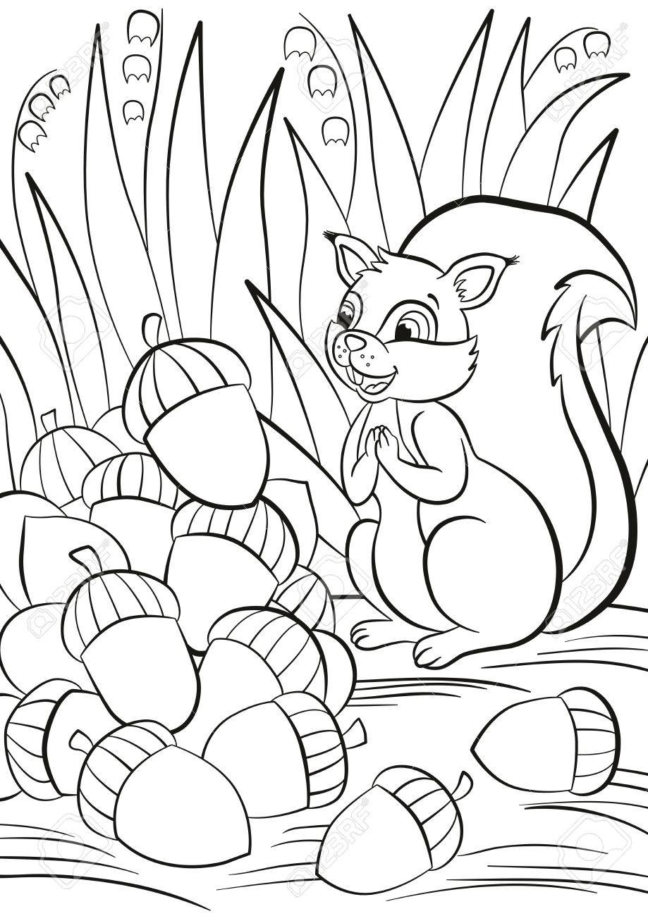 SVG, Vettoriale - Colorare. Poco Simpatico Scoiattolo Stand E Guarda Un Mucchio Di Ghiande. Lo Scoiattolo È Sorpreso E Felice.. Image 57465365