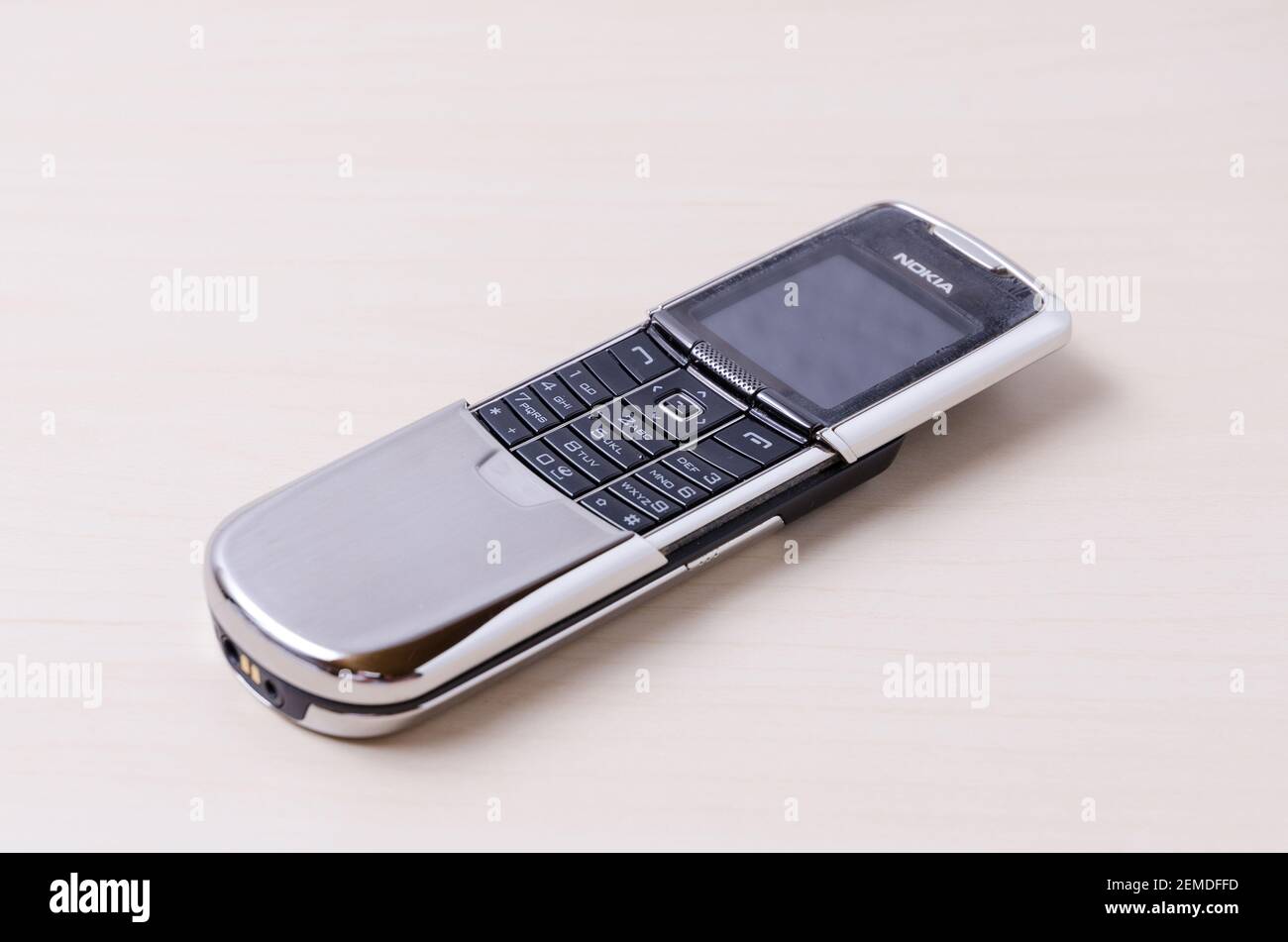 Telefono cellulare o cellulare Nokia 8800 con cursore in acciaio inox da 2005 su sfondo o scrivania in legno lucido, primo piano, interni Foto stock - Alamy