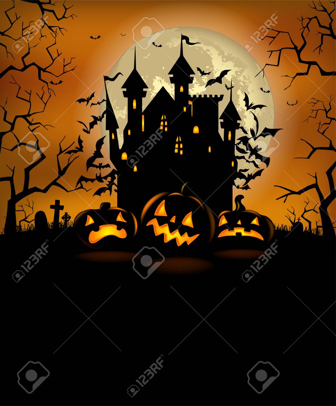 SVG, Vettoriale - Sfondo Di Halloween Con Zucche Spaventose, Castello Di Dracula E Varie Sagome Di Pipistrelli Volanti Contro La Luna Piena. Image 87739461