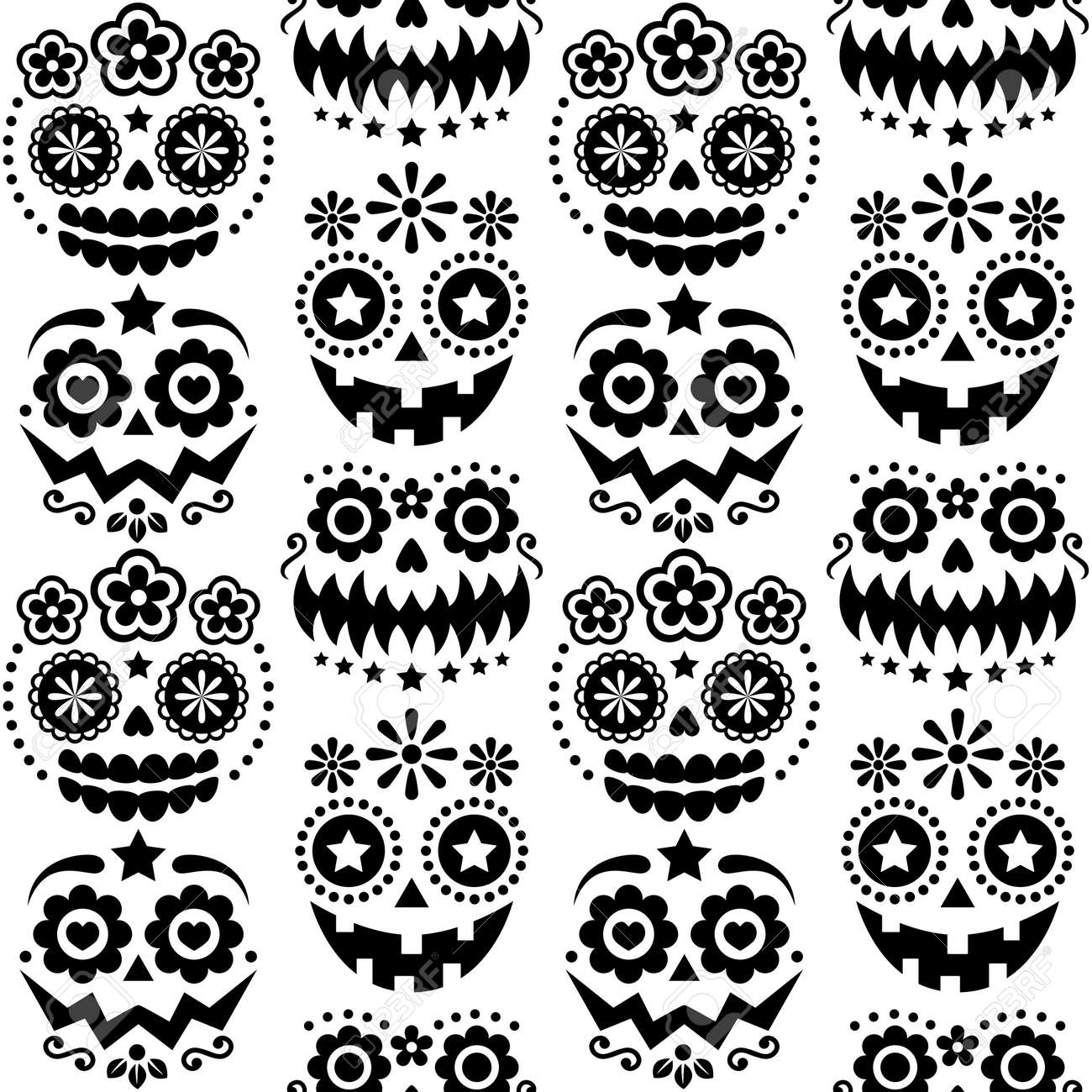 SVG, Vettoriale - Halloween E Dia De Los Muertos Teschi E Facce Di Zucca Vettore Motivo Senza Giunture - Design Tessile In Stile Teschio Di Zucchero Messicano. Image 149856712