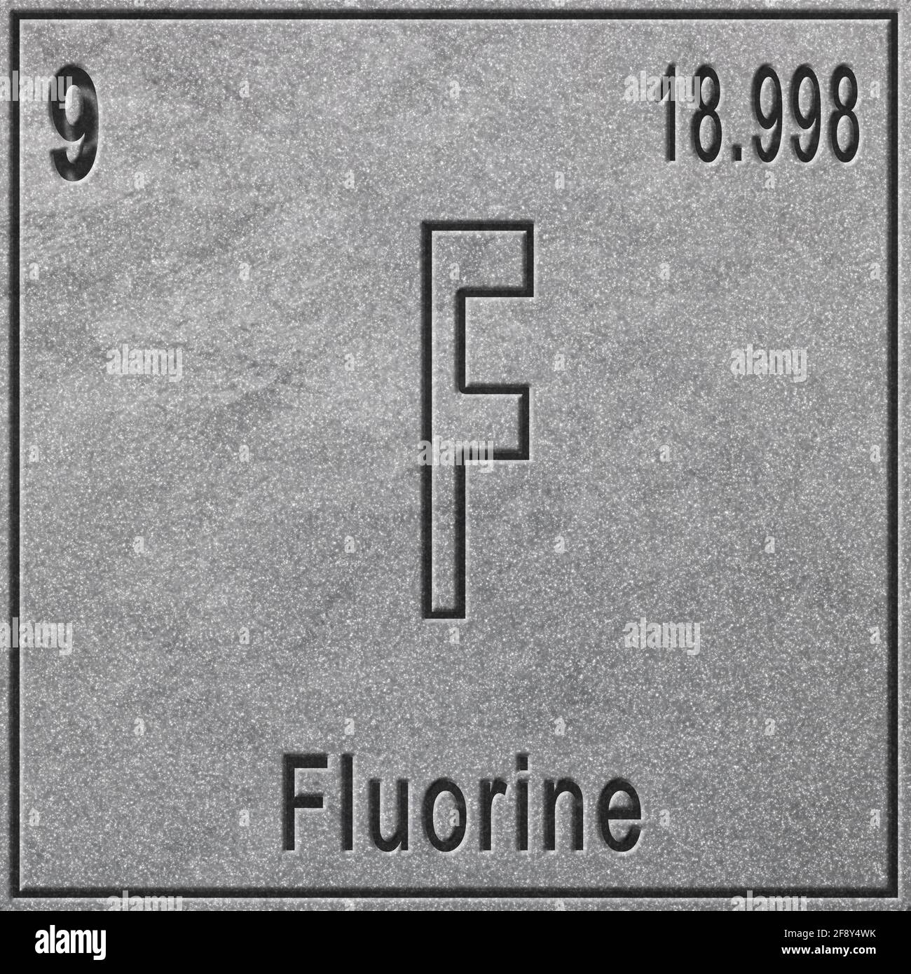 Elemento chimico fluoro, segno con numero atomico e peso atomico, elemento Tavola periodica, sfondo argento Foto stock - Alamy