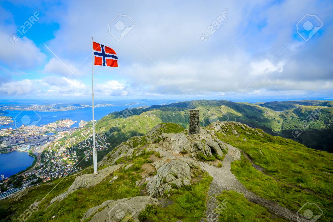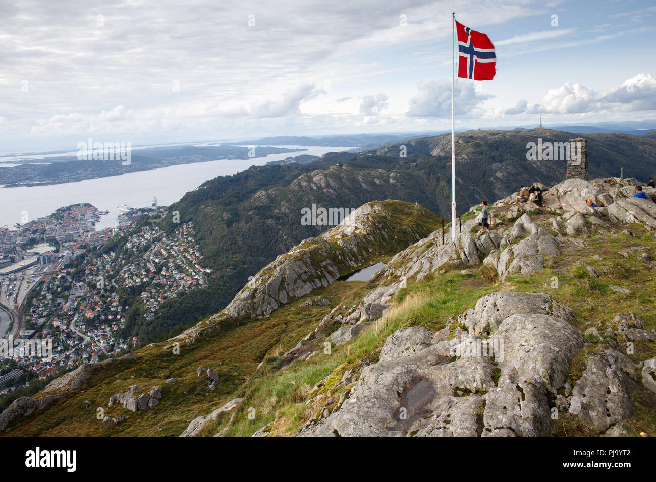 Mount Ulriken with the flag of Norway and view of Bergen. Skyline, clouds, fjords, mountains, rocks, cityscape, hiking route. Norway, Scandinavia, tou Stock Photo - Alamy