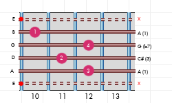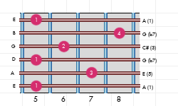 La# 7#9#5 Accordi estesi di settima di dominante, nona aumentata e quinta aumentata (1, 3, #5, b7, #9) | Dizionario degli accordi di chitarra
