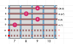 La# 7#9 Accordi estesi di settima di dominante e nona aumentata (1, 3, 5, b7, #9) | Dizionario degli accordi di chitarra