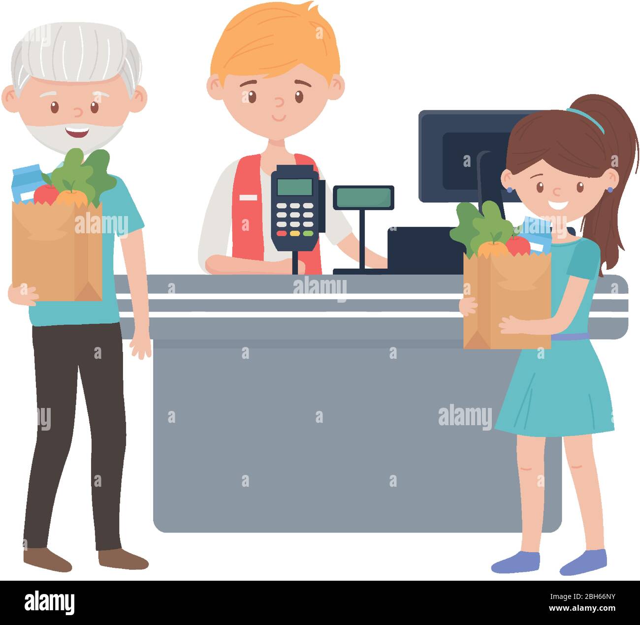 Contatore con registro di cassa venditore vecchio uomo e donna design di commercio commerciale negozio al dettaglio acquistare pagamento bancario e consumismo tema Vector illustrazione Immagine e Vettoriale - Alamy