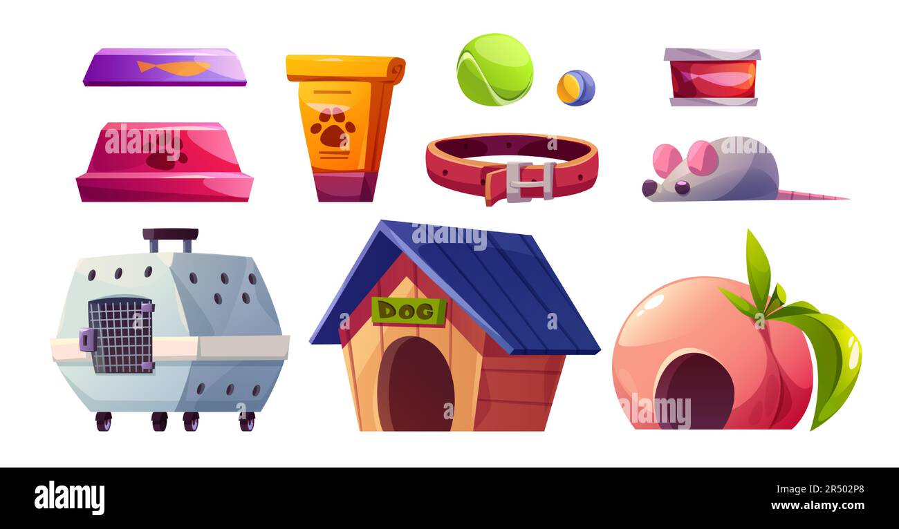 PET shop interno isolato vettore cartoon clipart. Giocattolo animale e cibo supermercato al coperto per acquistare clipart. Petshop business con articoli e forniture nazionali per cuccioli. Sonno doggy, mouse e gatto portatore