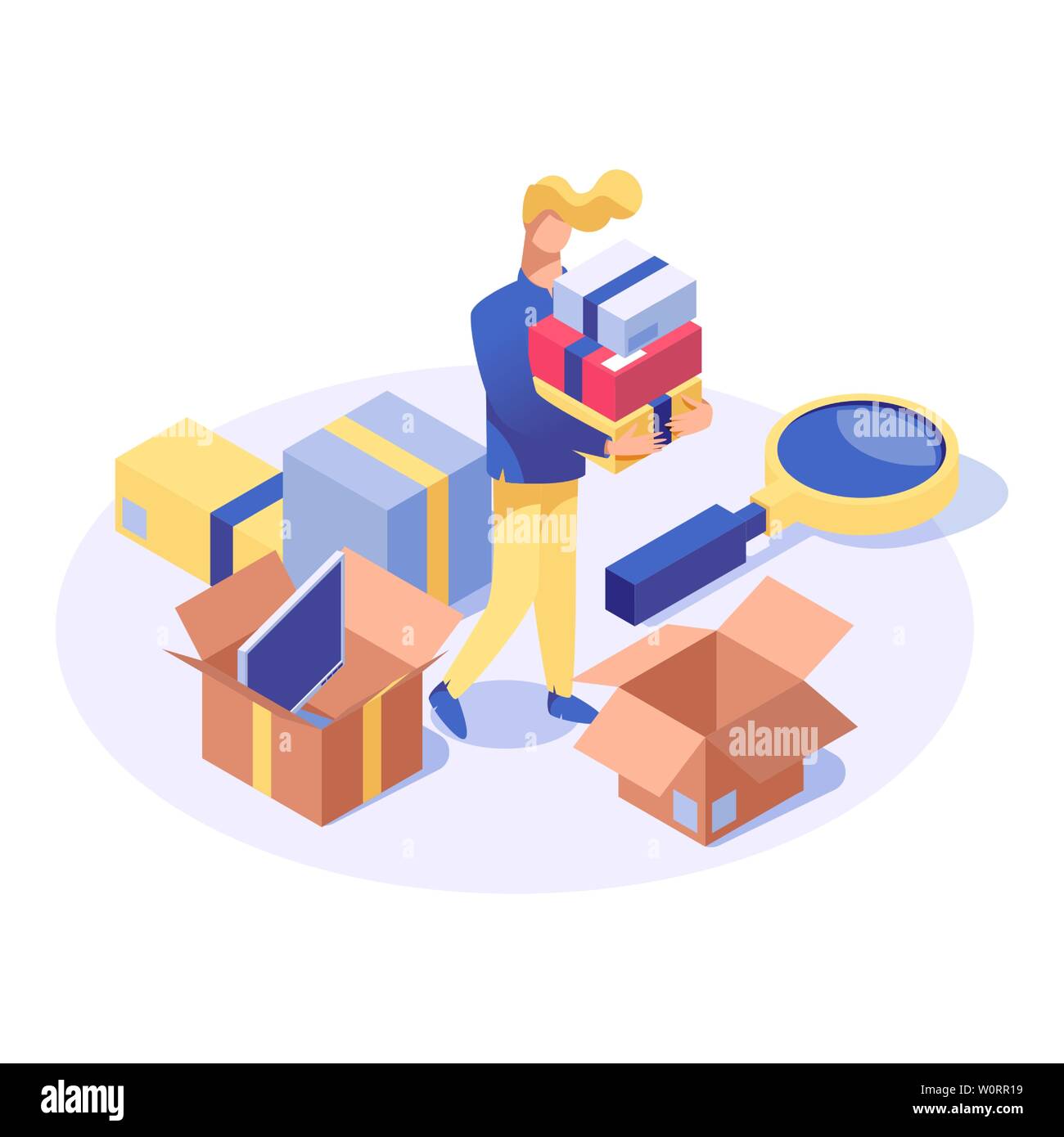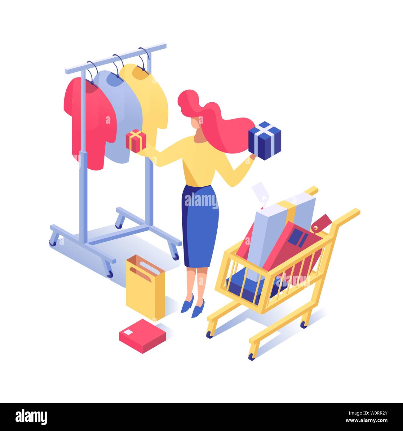 Acquirente di acquistare prodotti vettore illustrazione isometrica. Shop assistant fare l'inventario, il cliente scegliendo holiday presenta 3d carattere. Analisi di mercato, ricerca di marketing isolato clipart Immagine e Vettoriale - Alamy