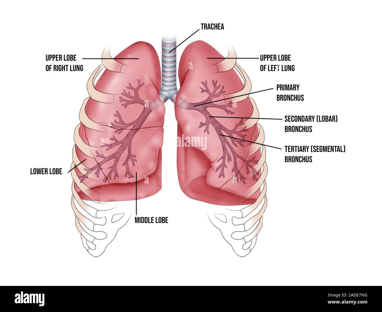 Bronco polmonari e anatomia del lobo, illustrazione. I polmoni umani sono divise in lobi con diversi lobi è servita da diverse vie aeree dei polmoni ( bronchi Foto stock - Alamy