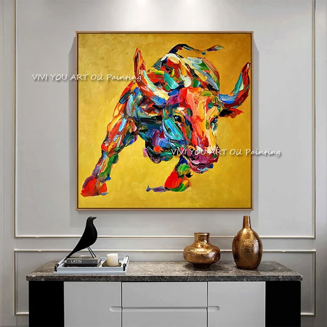 Il toro colorato dipinto a mano animale creativo arte astratta pittura a olio su tela dipinti per soggiorno decorazione gialla - AliExpress