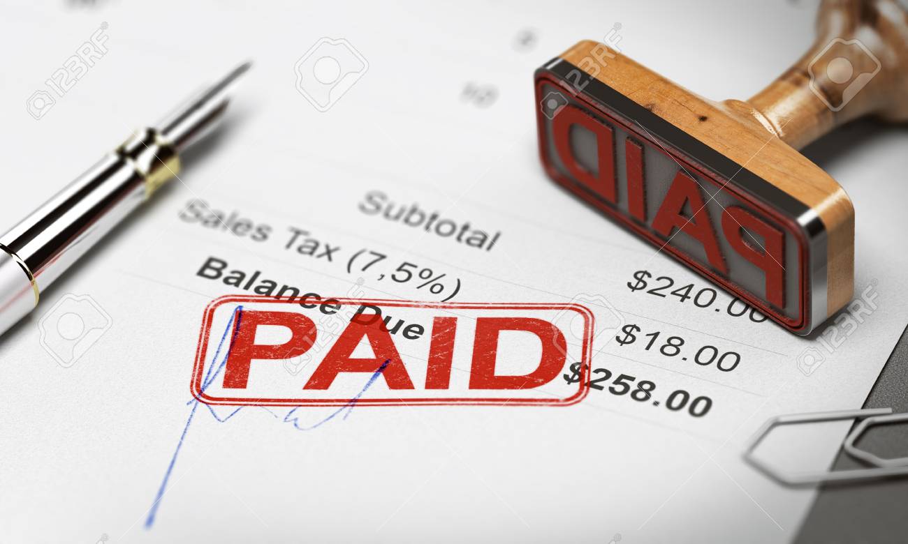 Immagini Stock - Timbro Di Gomma Con Il Testo Pagato Su Un Documento Di Fattura. Illustrazione 3d. Pagamento Del Concetto Di Debiti.. Image 100990212