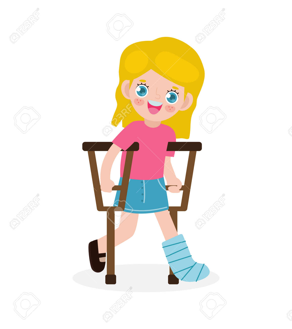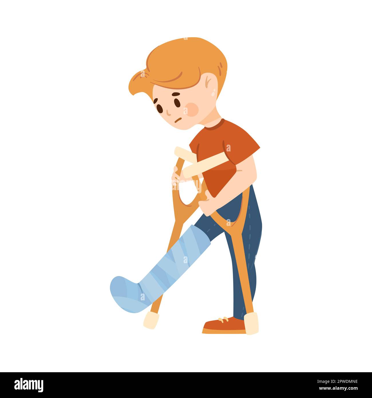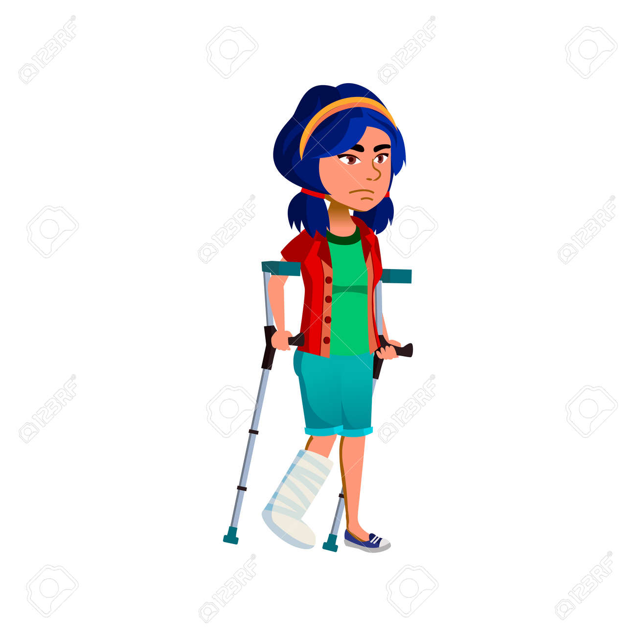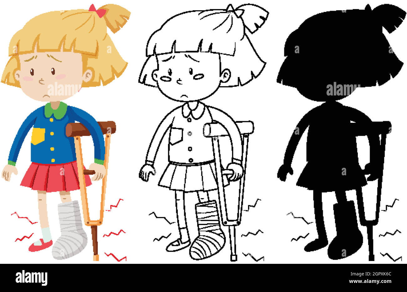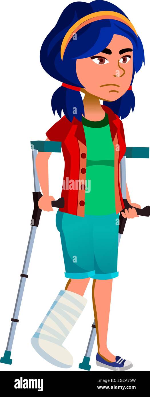 Ragazza triste con gamba rotta che cammina su cartoni animati crutches vettore Immagine e Vettoriale - Alamy