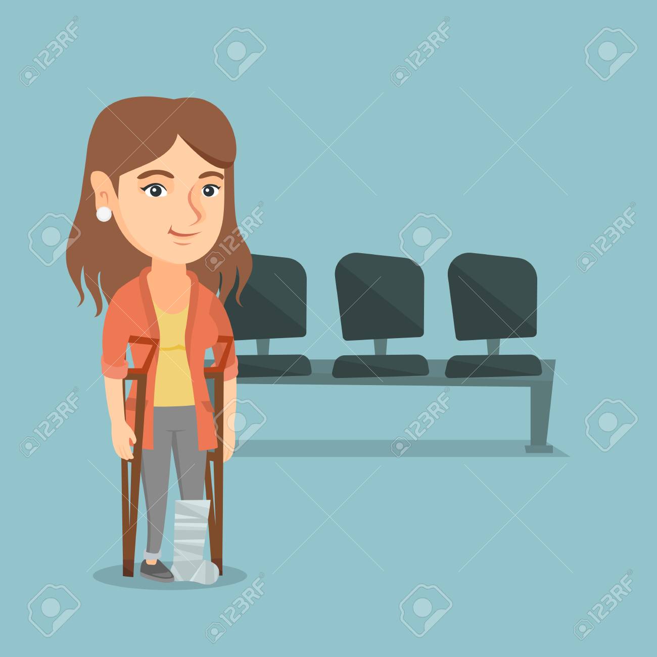 SVG, Vettoriale - Donna Caucasica Danneggiata Con Una Gamba In Gesso. Donna Con Gamba Rotta In Gesso Usando Le Stampelle. Giovane Donna Con Gamba Fratturata In Piedi In Ospedale. Illustrazione Di Cartone