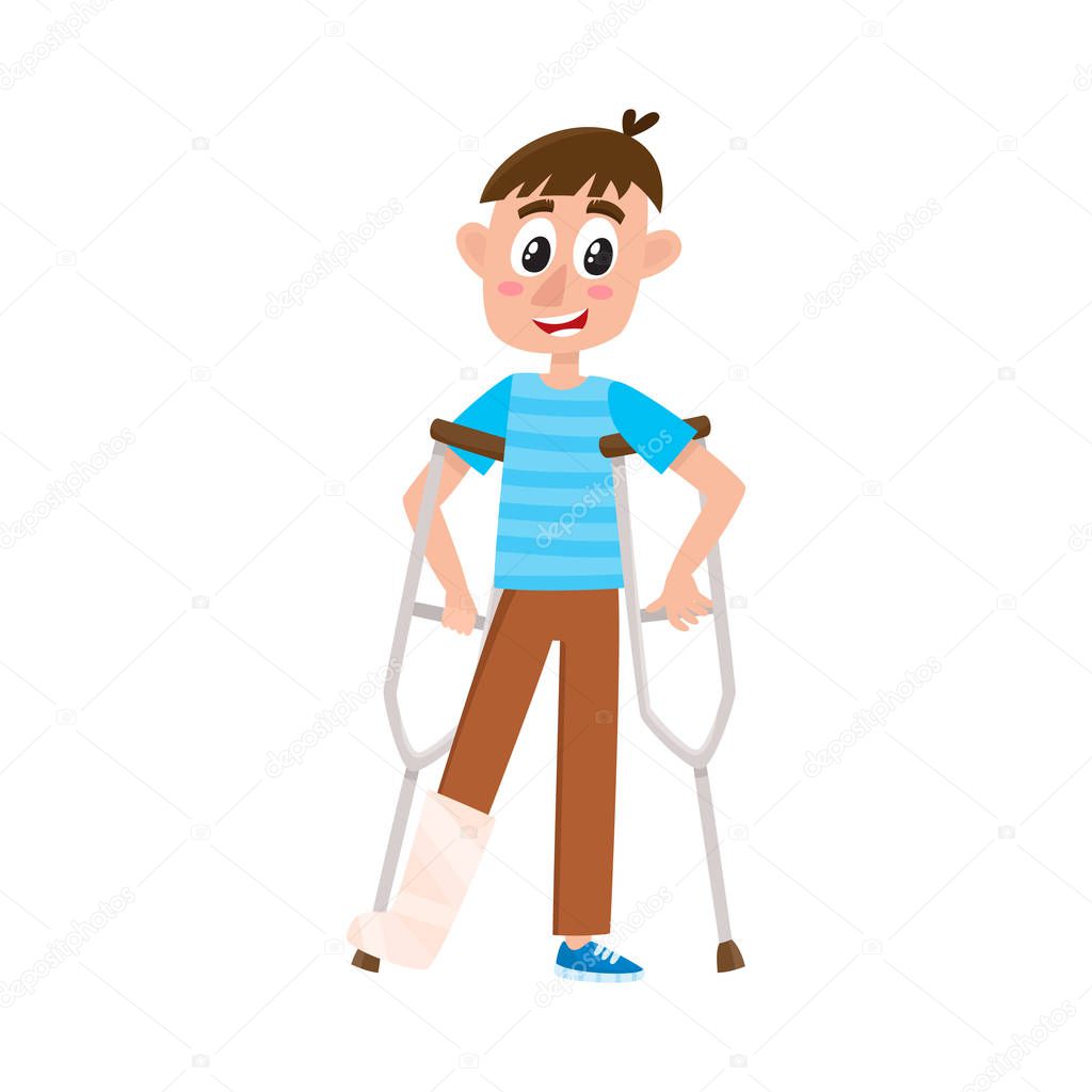 SVG, Vettoriale - Bambino Caucasico Ferito Con Una Gamba Rotta Nel Gesso. Bambini Piccoli In Piedi Sulle Stampelle, Personaggio Disabile Adolescente Cartone Animato Gamba Rotta In Gesso. Isolato Su Sfondo Bianco Illustrazione