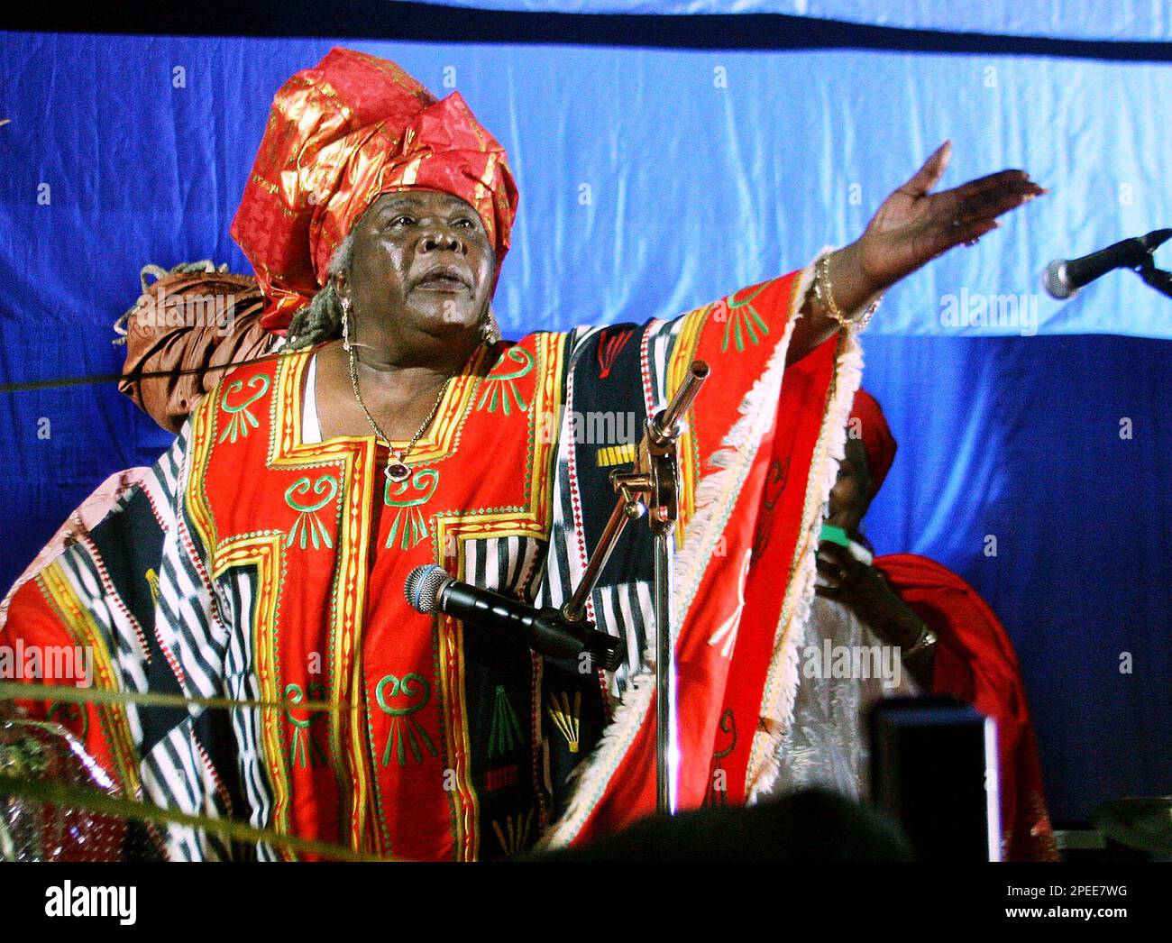 Cedella Marley Booker, mother of late reggae legend Bob Marley, sends a kiss to the public after performing on stage in Addis Ababa City Hall, Ethiopia, on Tuesday, Feb. 1, 2005 at
