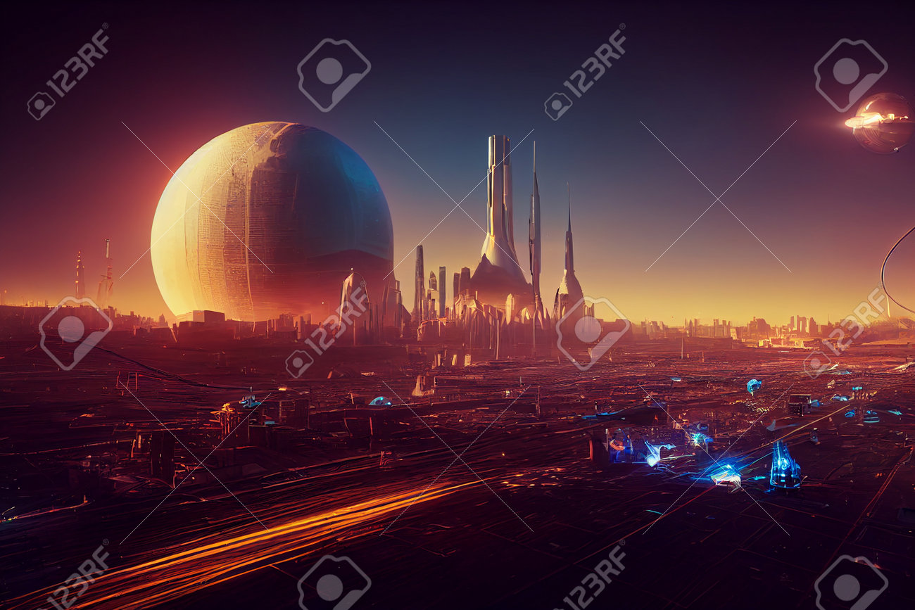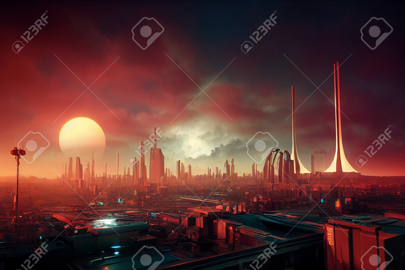 Sci-Fi Futuristic High Technologic Metropolis Skyline On Red Planet Art Illustration. Extraterrestrial Civilization World Scenery 3D Background. AI Neural Network Generated Art Fantastic Wallpaper Stock Photo, Picture and Royalty Free Image. Image