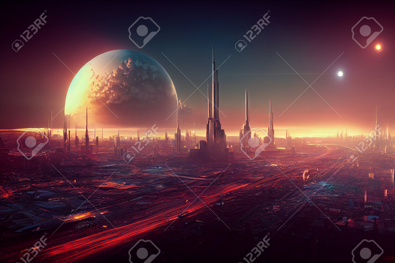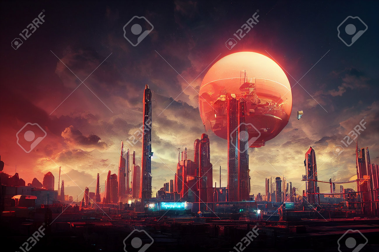 Futuristic High Technologic Metropolis Skyline on Red Alien Planet Art Illustration. Extraterrestrial Civilizati… | Planets art, Fantastic wallpapers, 3d background