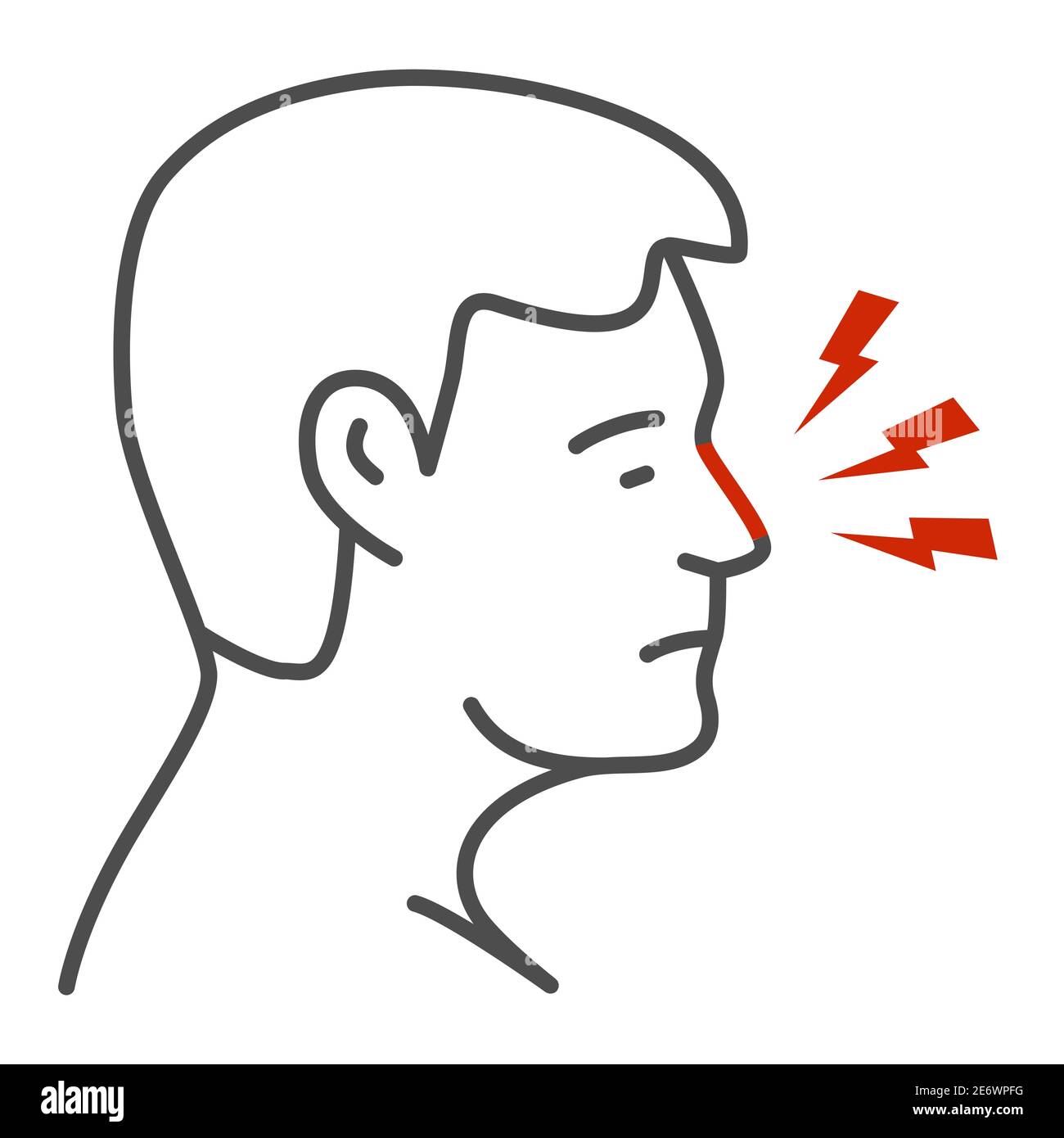 Il naso fa male l'icona della linea sottile, il concetto di dolore al corpo, il naso umano con il simbolo del fulmine su sfondo bianco, l'icona del dolore al naso in stile
