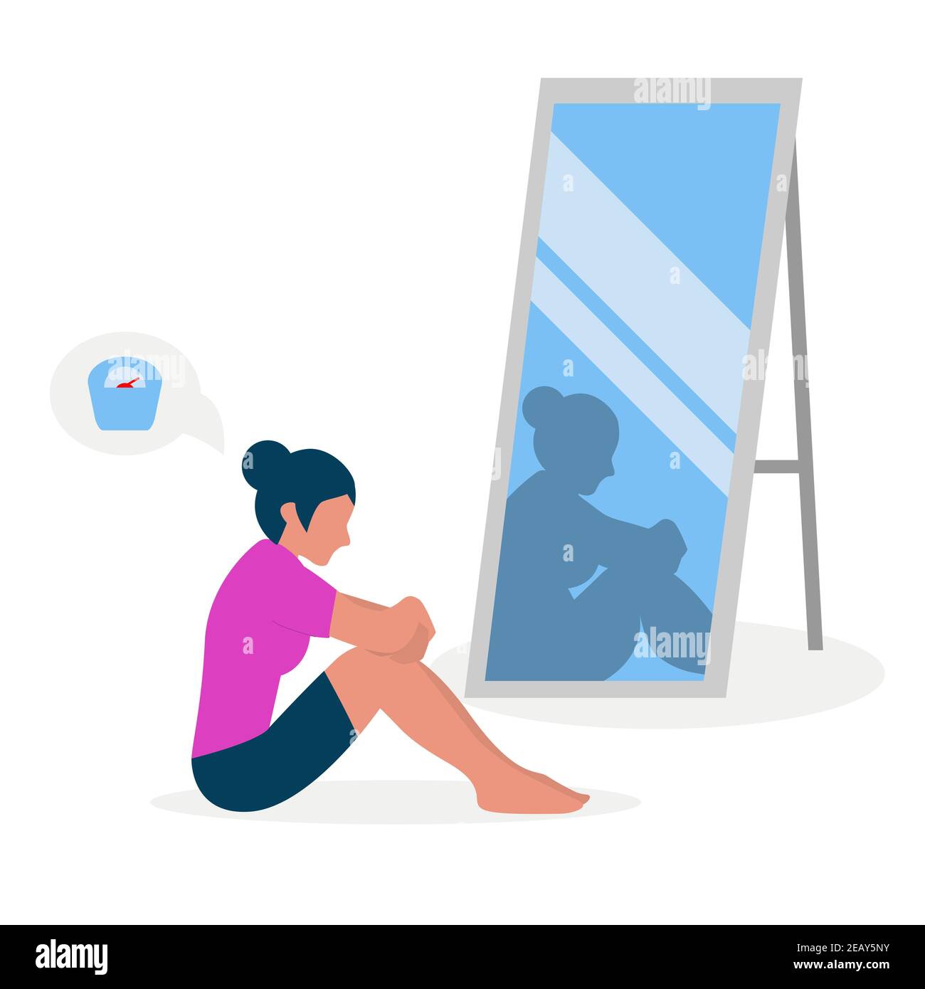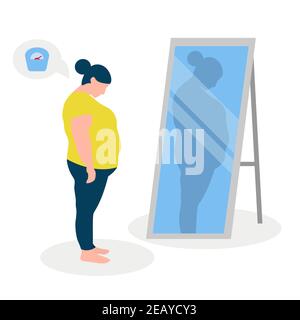 Immagine vettoriale piatta di una ragazza grassa con bassa autostima in piedi davanti ad uno specchio. La ragazza guarda nel suo riflesso distorto Immagine e Vettoriale - Alamy