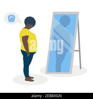 Immagine vettoriale piatta di una ragazza grassa nera con bassa autostima in piedi davanti ad uno specchio. La ragazza guarda nel suo riflesso distorto Immagine e Vettoriale - Alamy