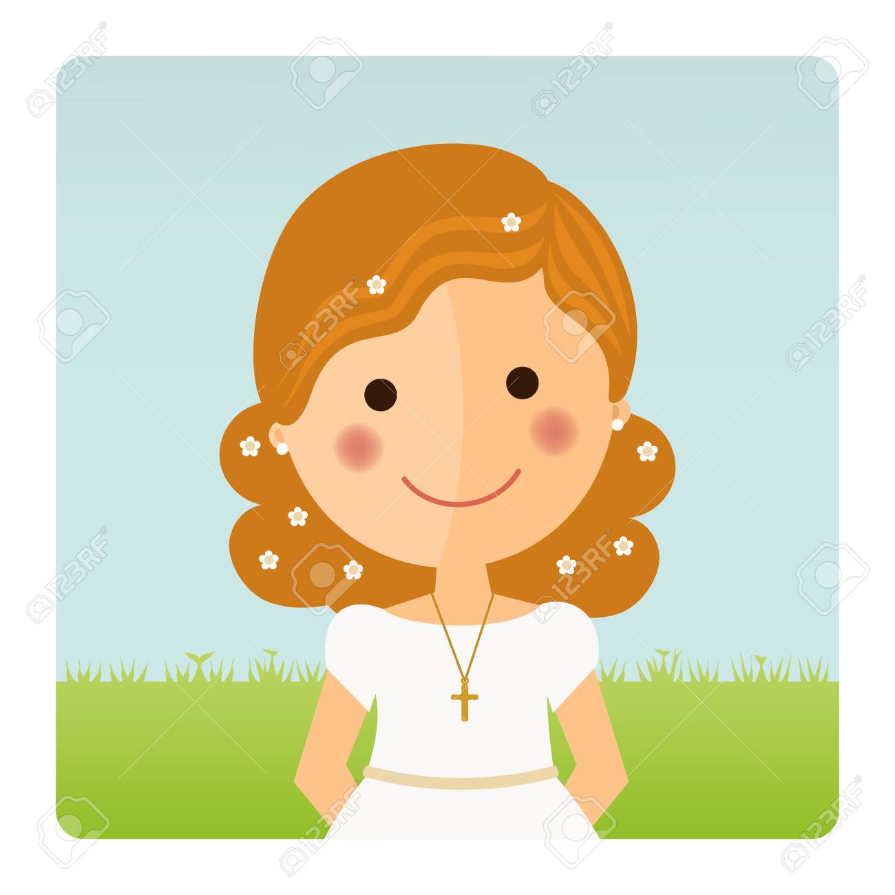 SVG, Vettoriale - Priorità Alta Di Comunione Della Ragazza Con Capelli Ricci Sulla Priorità Bassa Del Cielo Blu. Image 71353943