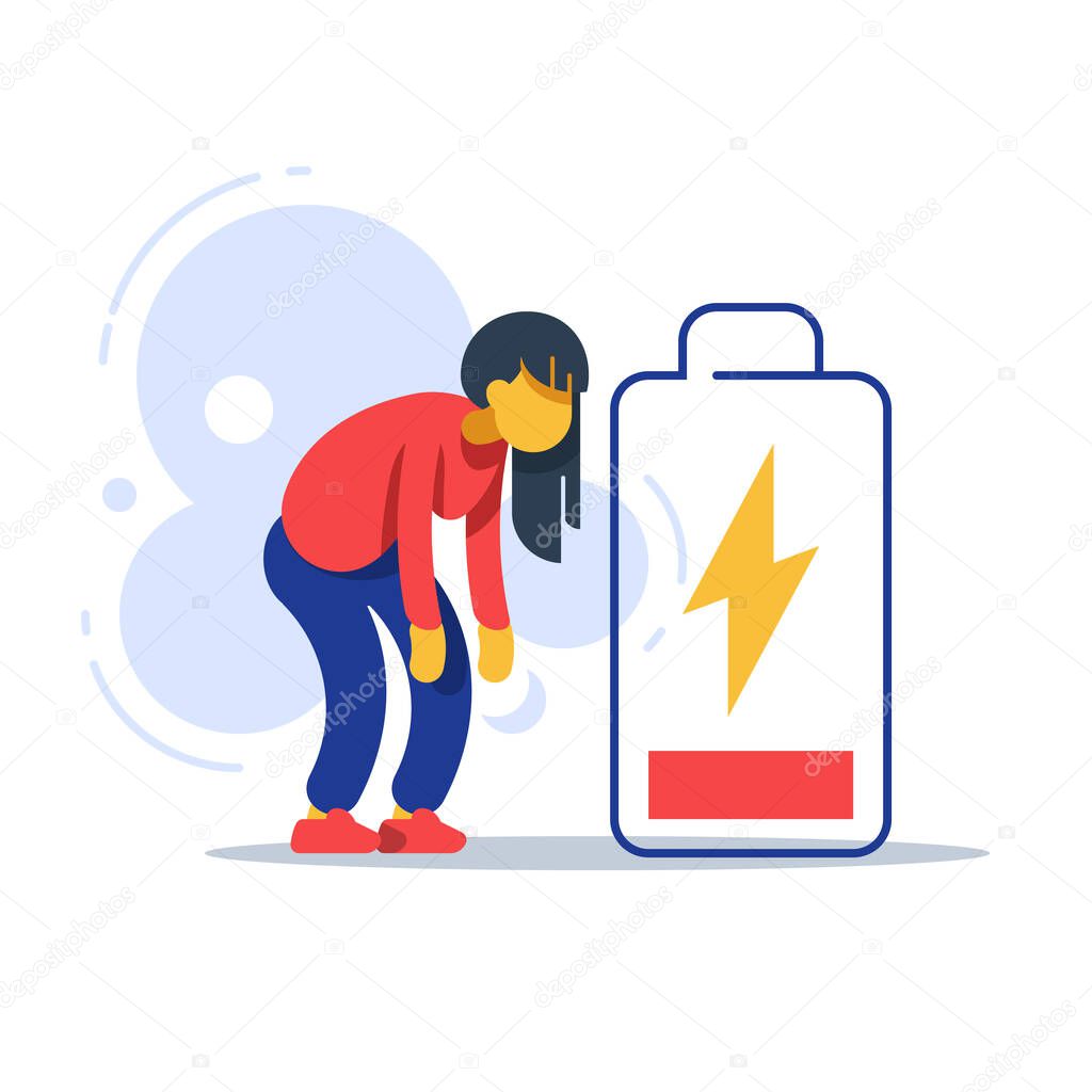 Ragazza carina felice e stanca con indicatore di batteria alta e bassa. fumetto piatto isolato su bianco | Vettore Premium