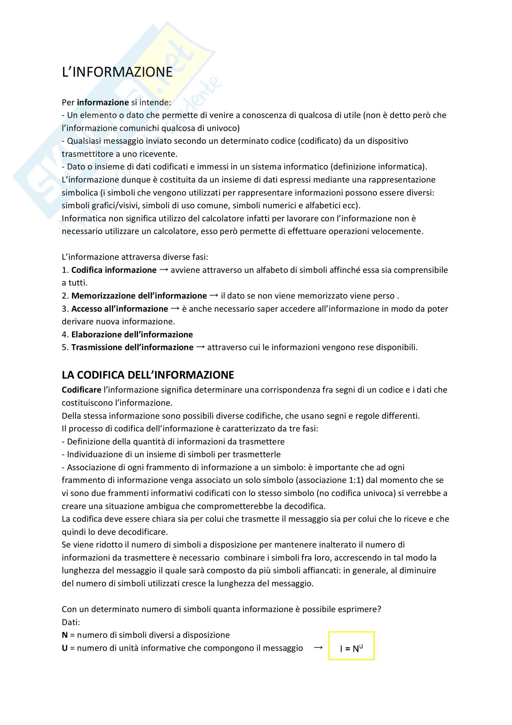 Codifica delle informazioni completo | Sintesi del corso di Elementi di Informatica | Docsity