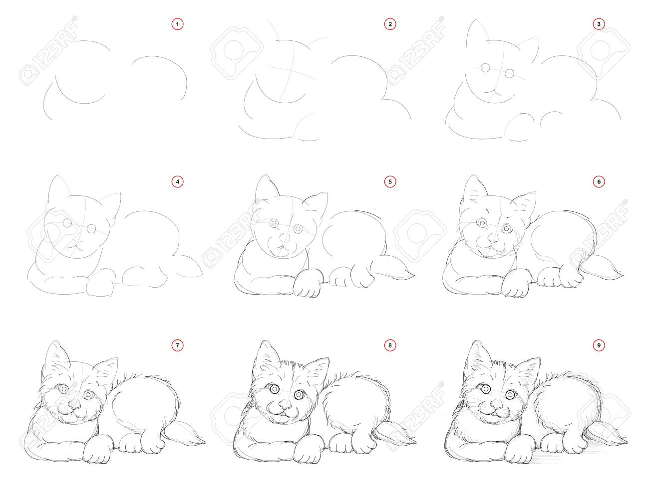 SVG, Vettoriale - Come Disegnare Uno Schizzo Immaginario Graduale Di Un Simpatico Gattino. Creazione Passo Dopo Passo Disegno A Matita. Pagina Educativa. Manuale Scolastico Per Lo Sviluppo Delle Abilità Artistiche. Immagine Vettoriale
