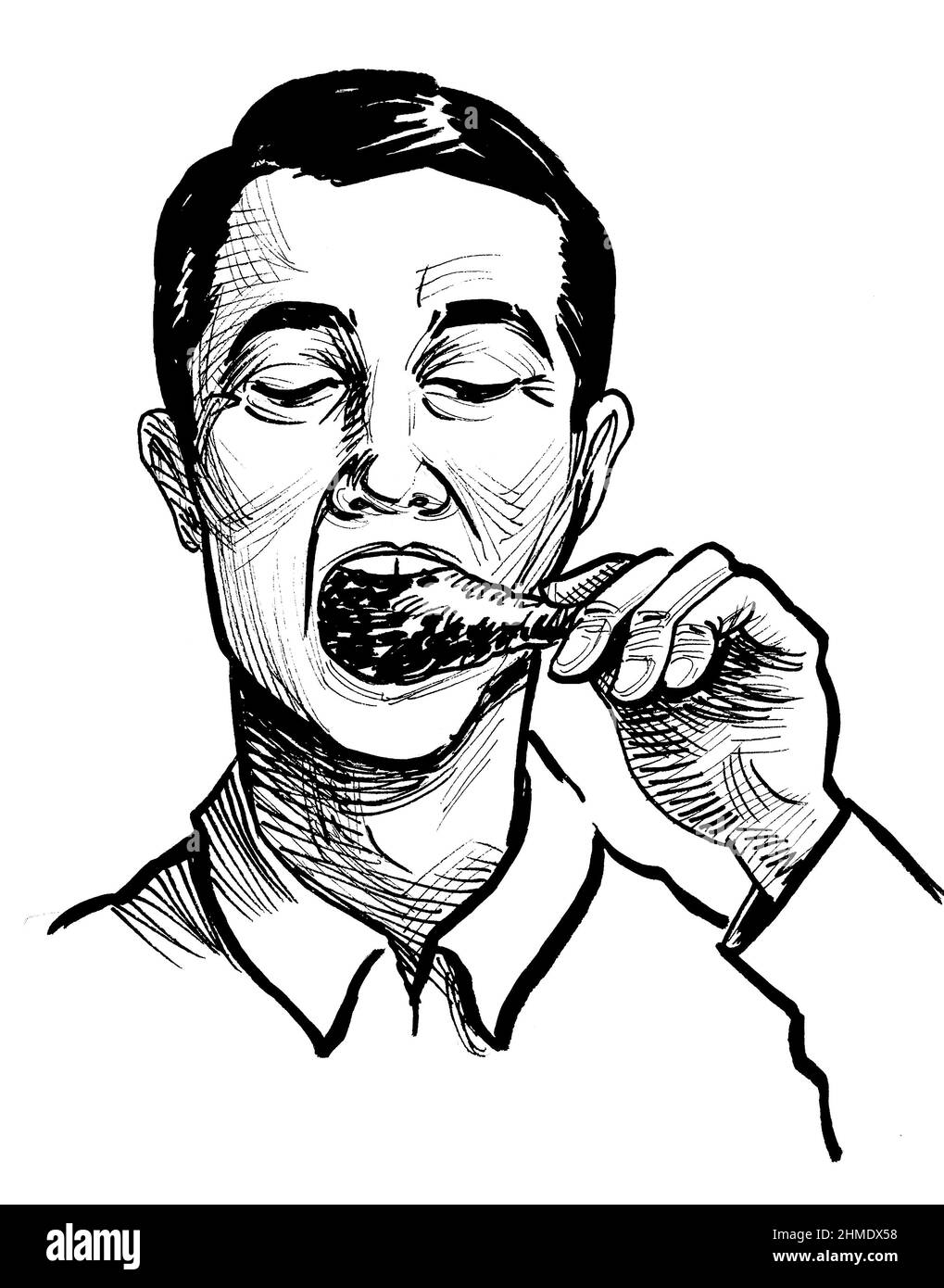Uomo che mangia coscia di pollo. Disegno in bianco e nero con inchiostro Foto stock - Alamy