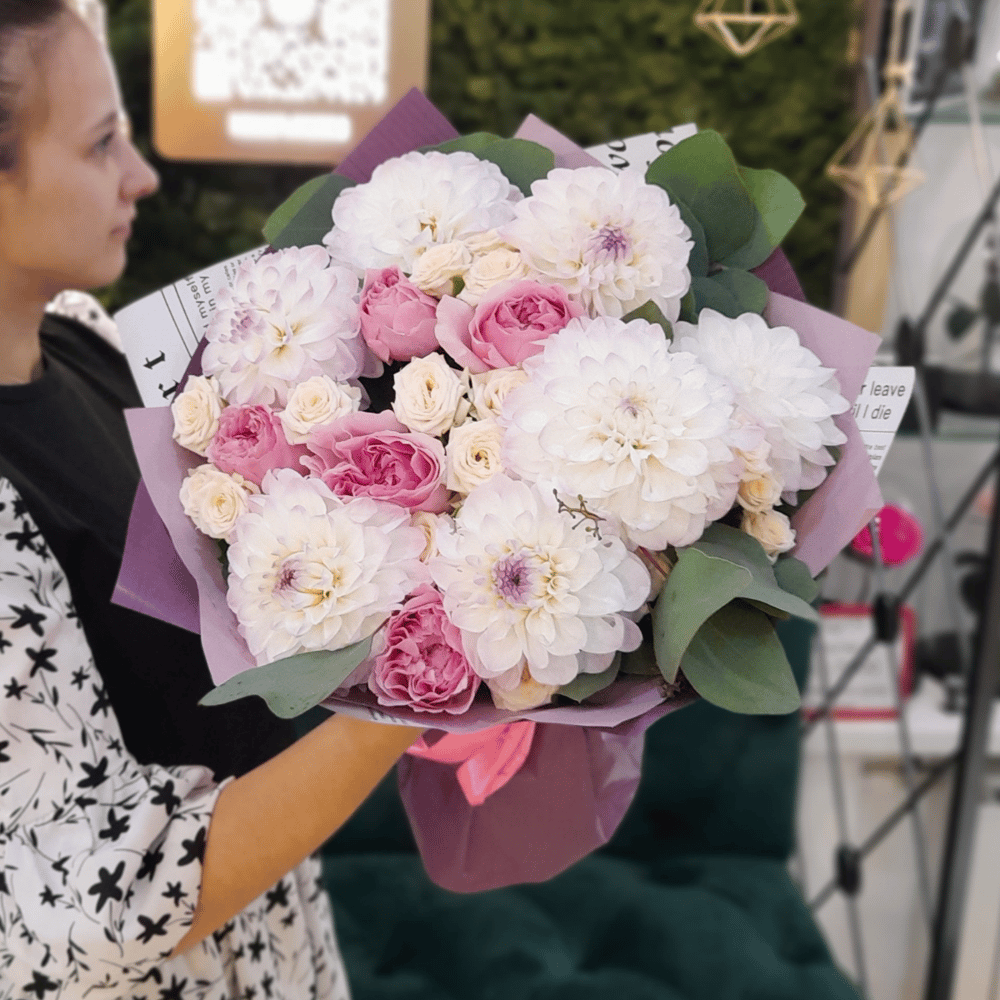 Bouquet of white Dahlias and Roses - order and send for 51 $ with same day delivery - MyGlobalFlowers