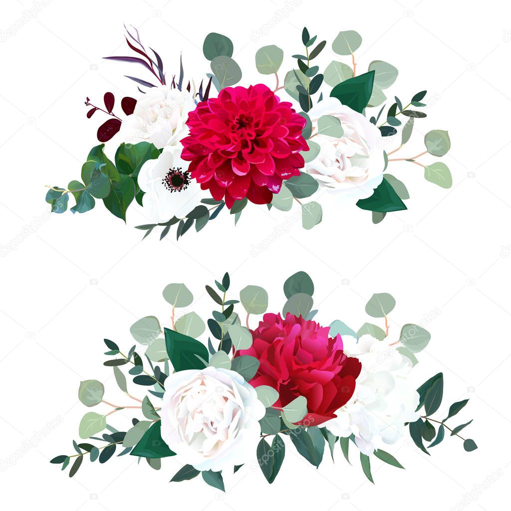 Classic Luxurious Red Roses, Pink Carnation, Ranunculus, Dahlia, White Peony, Berry, Astilbe, Eucalyptus Vector Design Wedding Bouquets. Elegant Wedding Bunches Of Flowers. Isolated And Editable. Royalty Free SVG, Cliparts, Vectors, and Stock
