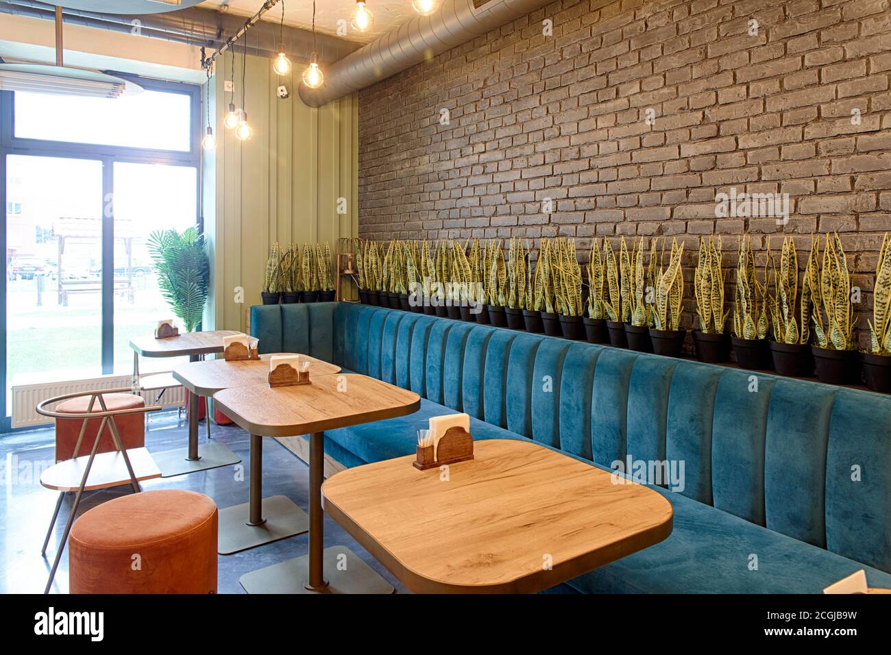 Interni di un ristorante, design moderno in pochi colori, arancione e blu Foto stock - Alamy